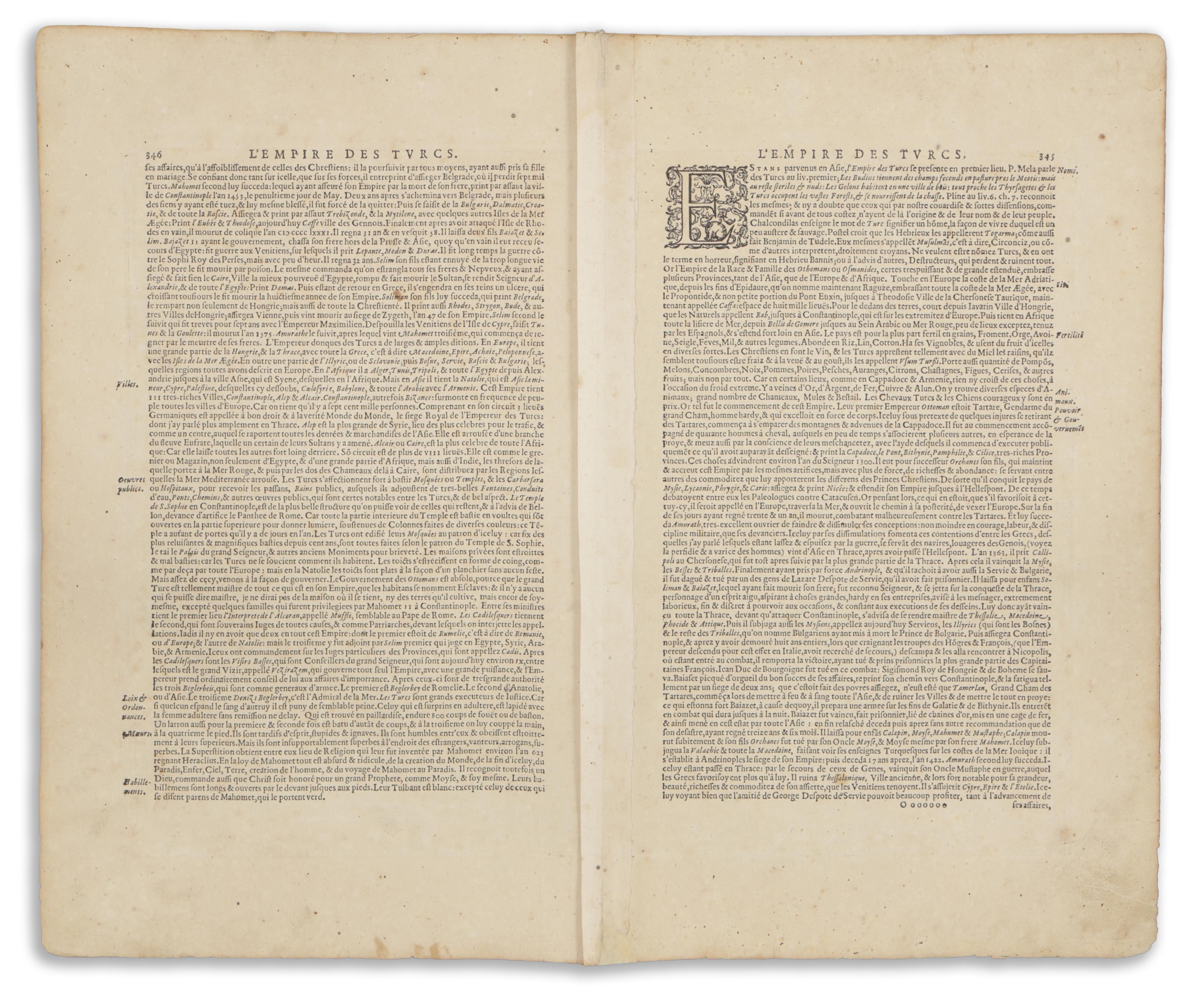 In good condition for its age. Restored along the fold close to the lower margin, slightly affecting the image field. French text on verso, page numbers 345-346, "Ooooooo", reinforced along fold.