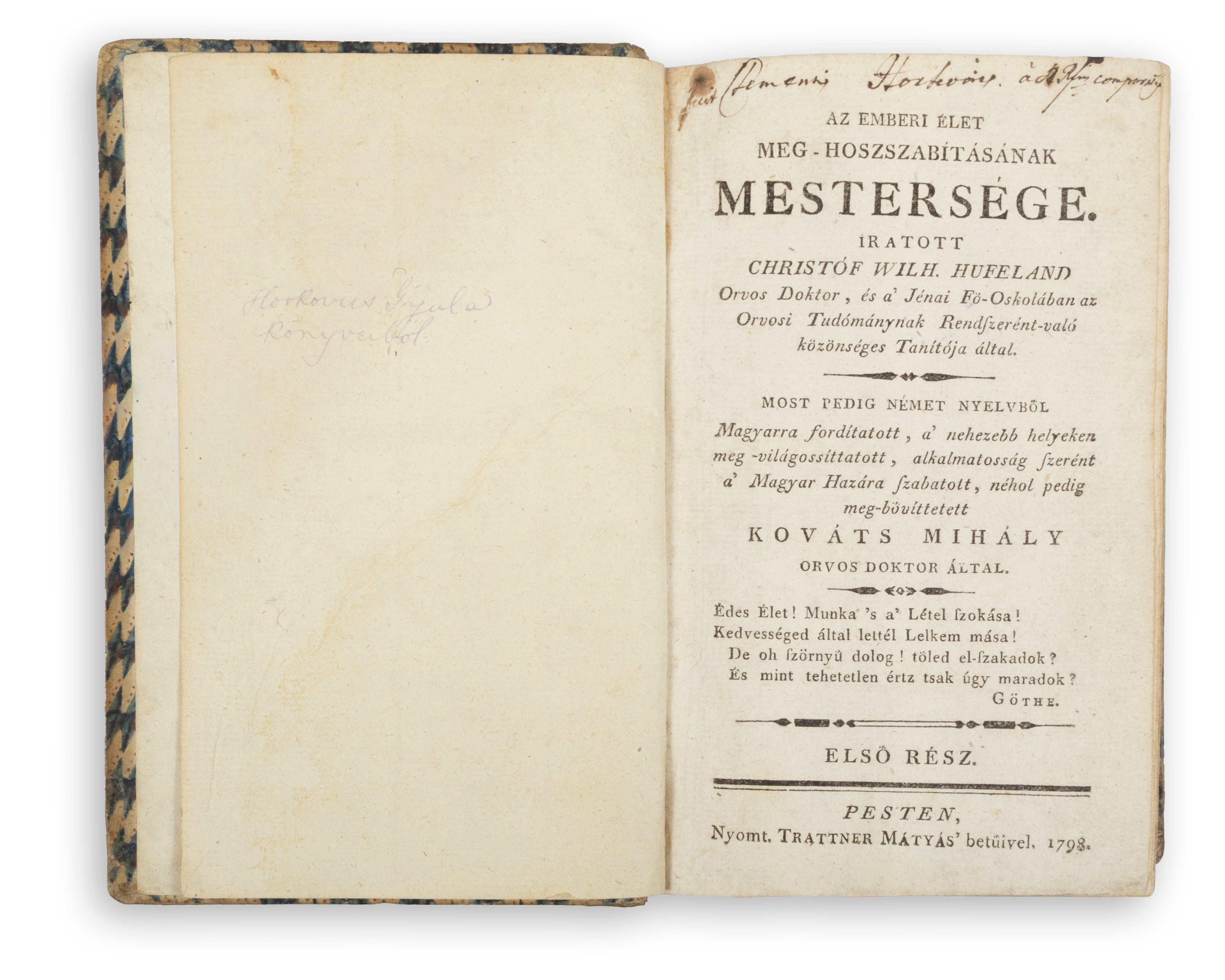 Hungarian translation of the work on healing the body, soul, and spirit by German physician, naturopath, and writer Christoph Wilhelm Friedrich Hufeland.