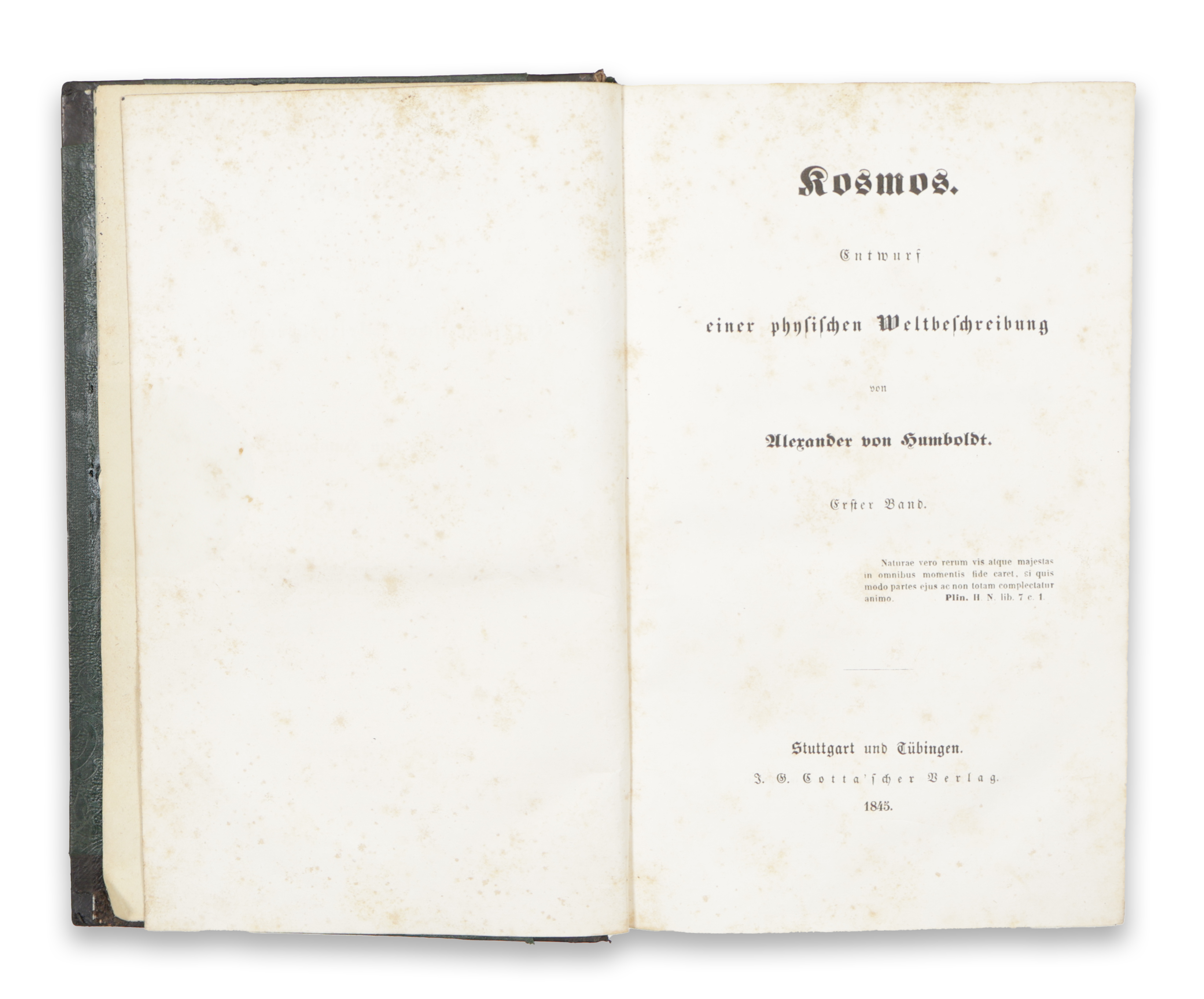 Alexander von Humboldt (1769–1859) német tudós és felfedező nagy hatású értekezésének első kiadása! Humboldt magnum opusának tekinthető munka előadássorozataként indult, amelyet a berlini egyetemen tartott. Öt kötetben jelent meg 1845 és 1862 között (az ötödik kötet posztumuszként, Humboldt jegyzetei alapján készült el). Az első kötetben Humboldt egy általános "természet-képet" fest, leírva a világűr és a Föld fizikai természetét. A második kötetben a tudomány történetét tárgyalja. Cosmos nagy népszerűségnek örvendett megjelenésekor: az első kötet két hónap alatt elfogyott, és a művet a legtöbb európai nyelvre lefordították, és annak ellenére, hogy már a természettudományok eltértek attól a romantikus szemlélettől, amelyet Humboldt e munkájában bemutatott, a művet még mindig jelentős tudományos és irodalmi teljesítménynek tekintik, amely befolyásolta a későbbi tudományos fejlődést, és egységesítő szemléletet adott a tudomány, a természet és az emberiség tanulmányozásának.