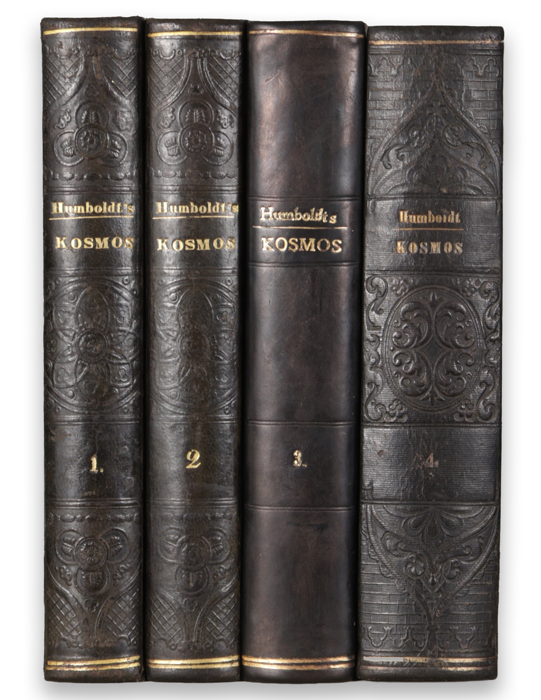 First edition of the highly influential treatise by German scientist and explorer Alexander von Humboldt (1769–1859)! This work, considered Humboldt's magnum opus, began as a series of lectures he delivered at the University of Berlin. It was published in five volumes between 1845 and 1862 (the fifth volume was published posthumously, based on Humboldt’s notes).