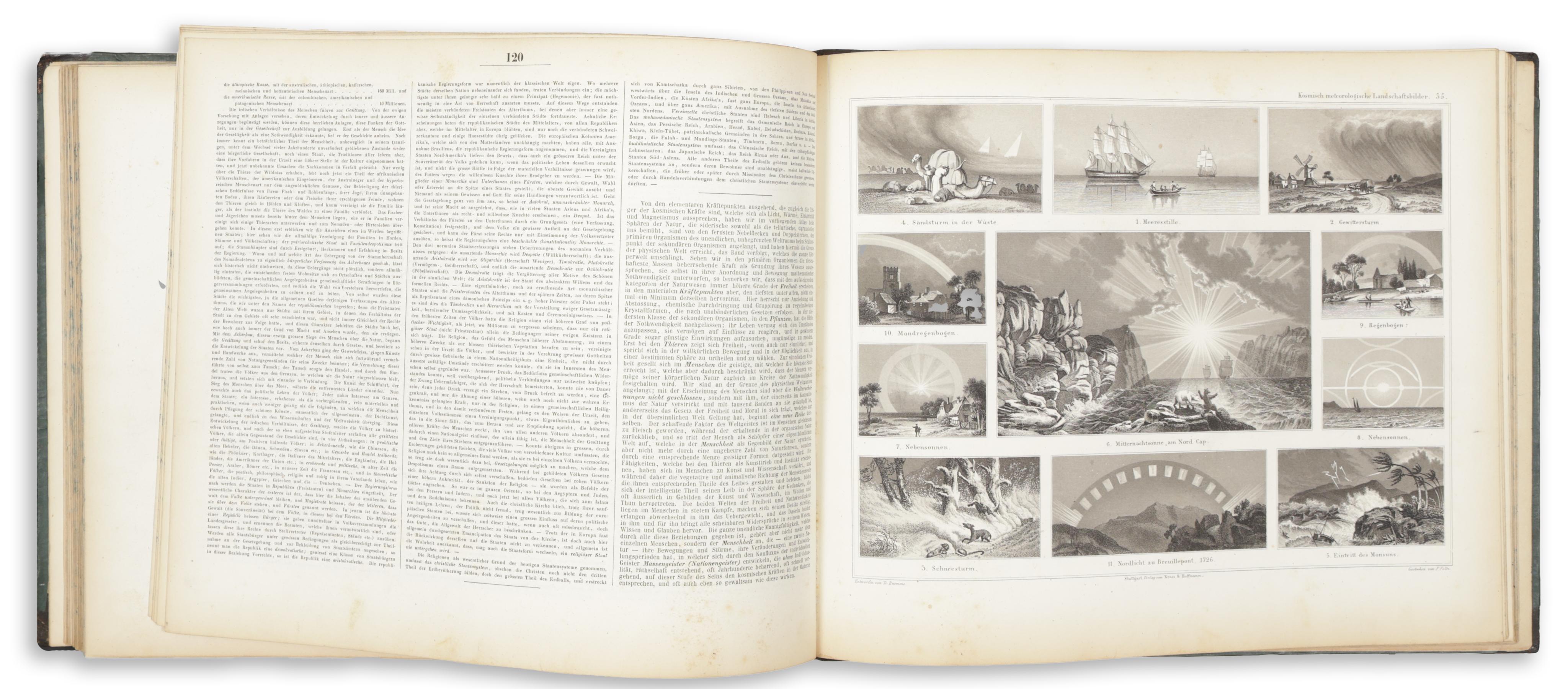 However, it does include the volume titled "Atlas zu Alex v. Humboldt's Kosmos", presented by Traugott Bromme and published by Kreiss & Hofmann as a companion to Humboldt’s work. Although Cosmos aimed to present the interrelations of natural phenomena, readers often viewed it as an educational textbook, which led to a demand for supplementary materials such as commentaries and atlases. In response to this need, the Englishmen Petermann and Johnston created the first supplementary atlas. In Germany, however, there was a lack of an illustrated work that would explain and complement the physical description of the world. Traugott Bromme attempted to fill this gap with the present atlas, which he published in 1851.