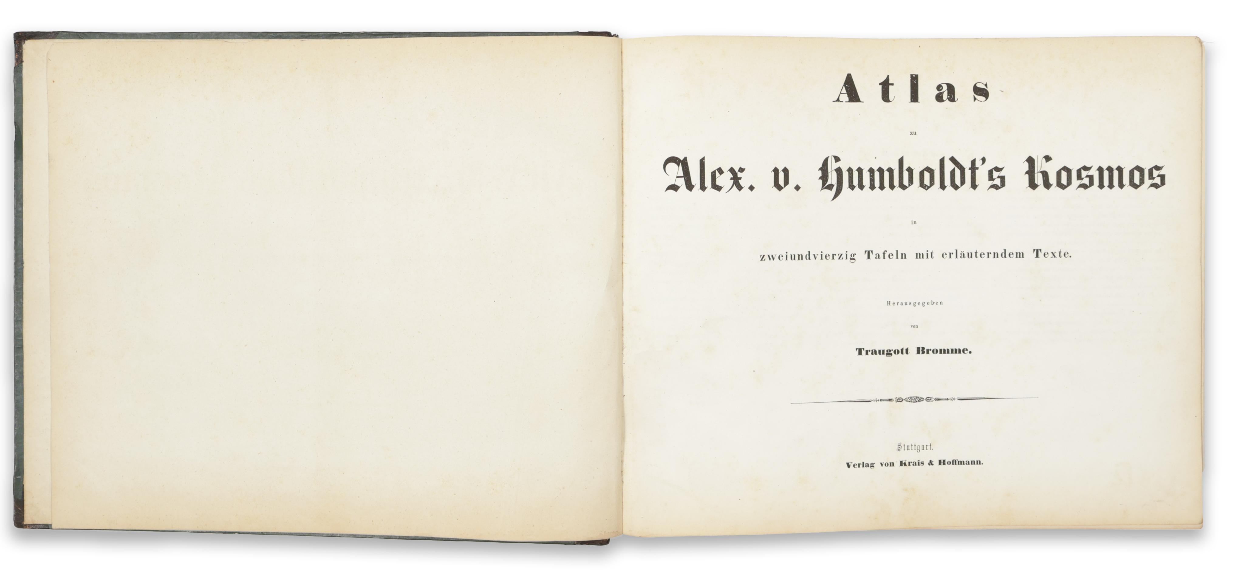 Viszont tartalmazza az ún. "Atlas zu Alex v. Humboldt's Kosmos" című kötetet, melyet Traugott Brome mutatta be, és a Kreiss & Hofmann kiadó adta ki Alexander von Humboldt művéhez. Habár a Cosmos a természeti jelenségek összefüggéseinek bemutatását tűzte ki célul, az olvasók gyakran oktató jellegű tankönyvként fogták fel, ami további segédletek, például kommentárok és atlaszok iránti igényt eredményezett. Erre az igényre válaszul elsőként az angol Petermann és Johnston készített a Humboldt művét kiegészítő atlaszt. Németországban azonban hiányzott egy olyan illusztrált mű, amely a világ fizikai leírását magyarázta és kiegészítette volna. Traugott Bromme ennek a hiányosságnak a pótlására tett kísérletként mutatta be a jelen atlaszt 1851-ben.