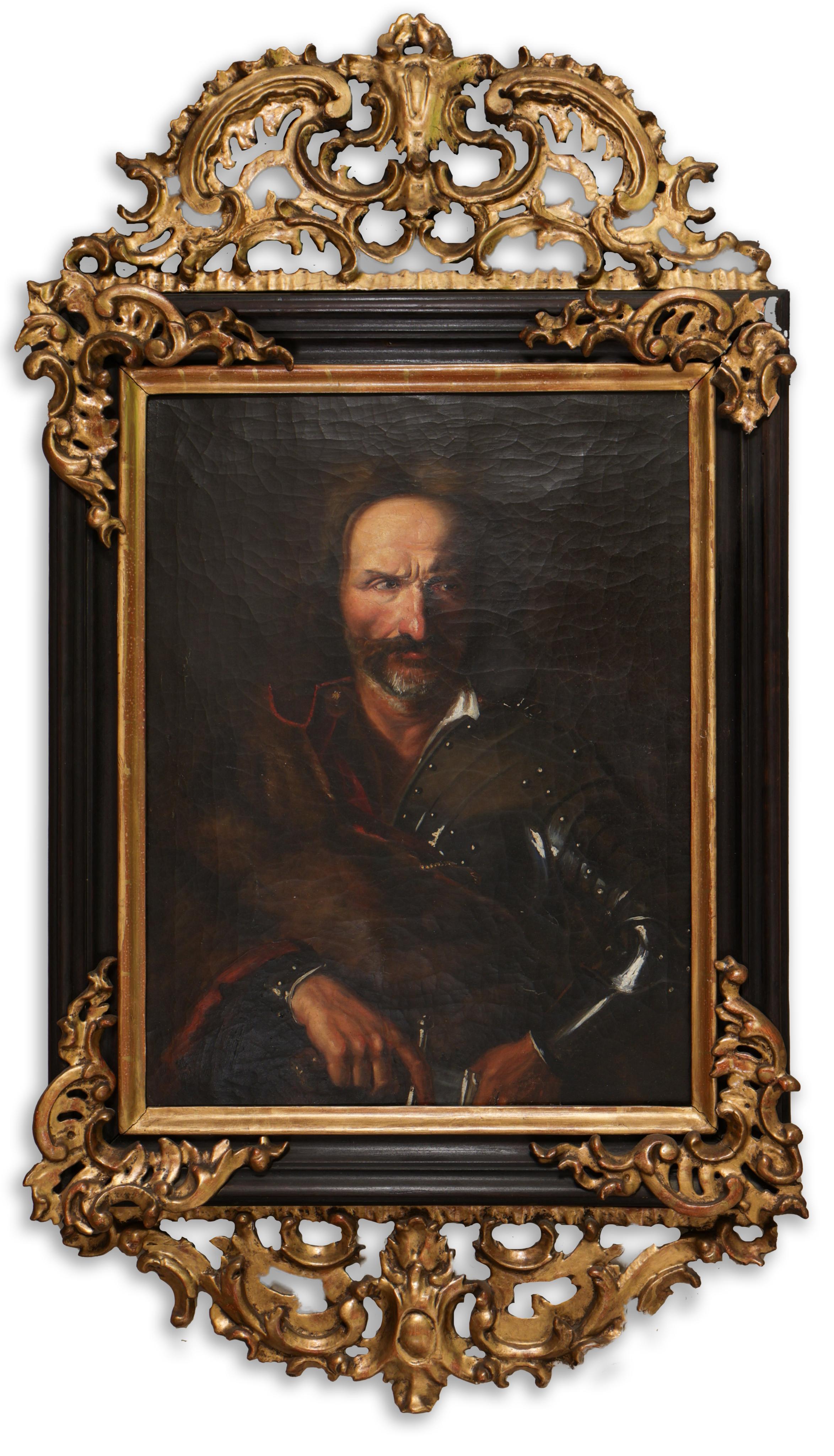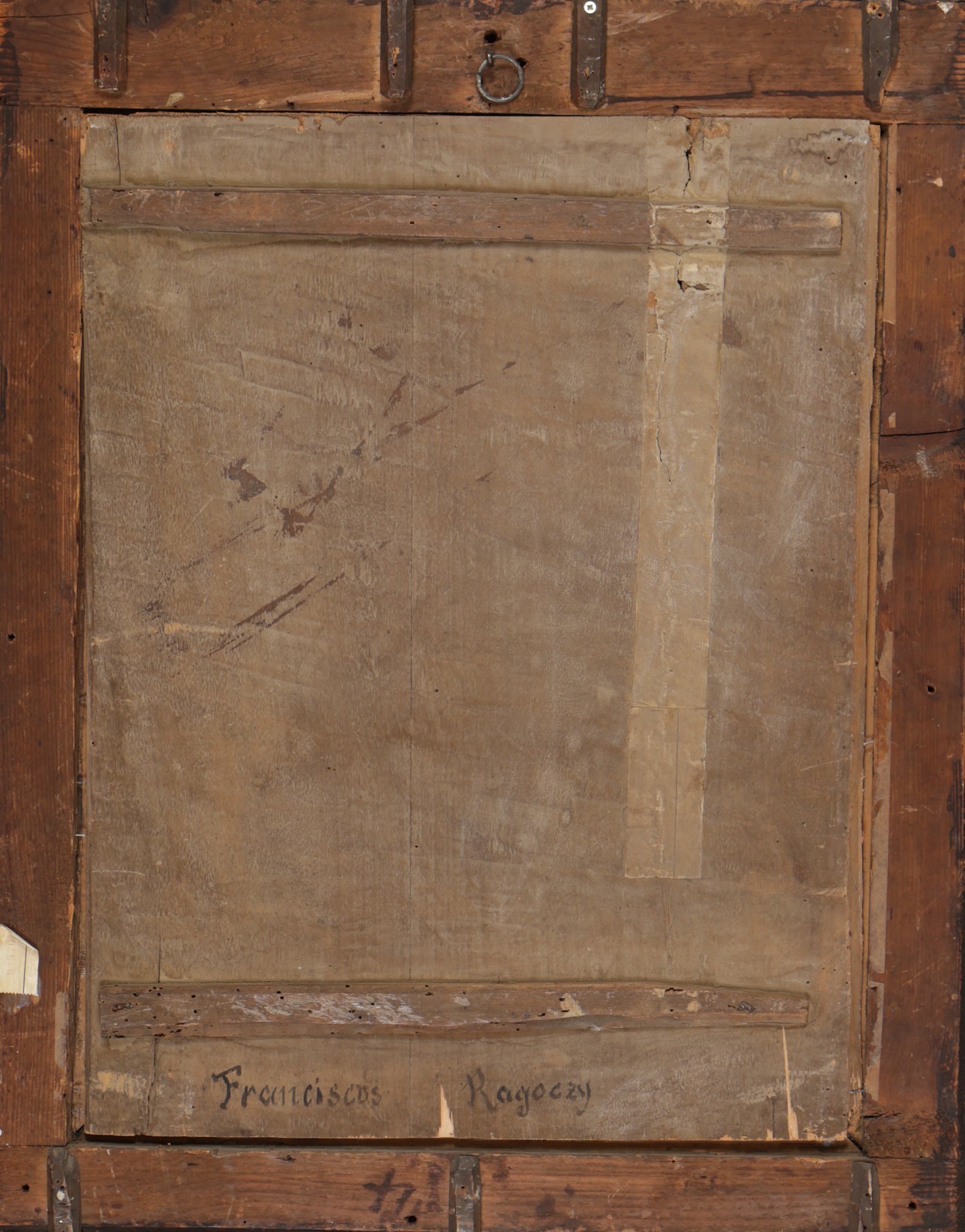 Olajfestmény falemezen. Korabeli másolat. Keret mérete a díszekkel:60×113 cm. Képméret:45×60 cm. Hátoldalán lent tintával Franciscus Ragoczy felirat. Korábban restaurált, a mozaikos repedések felülete elsimítva. A keret négy sarkán díszes rátét, fejnél és lábnál dúsan és igényesen faragott barokk stílusú növényi ornamentika.