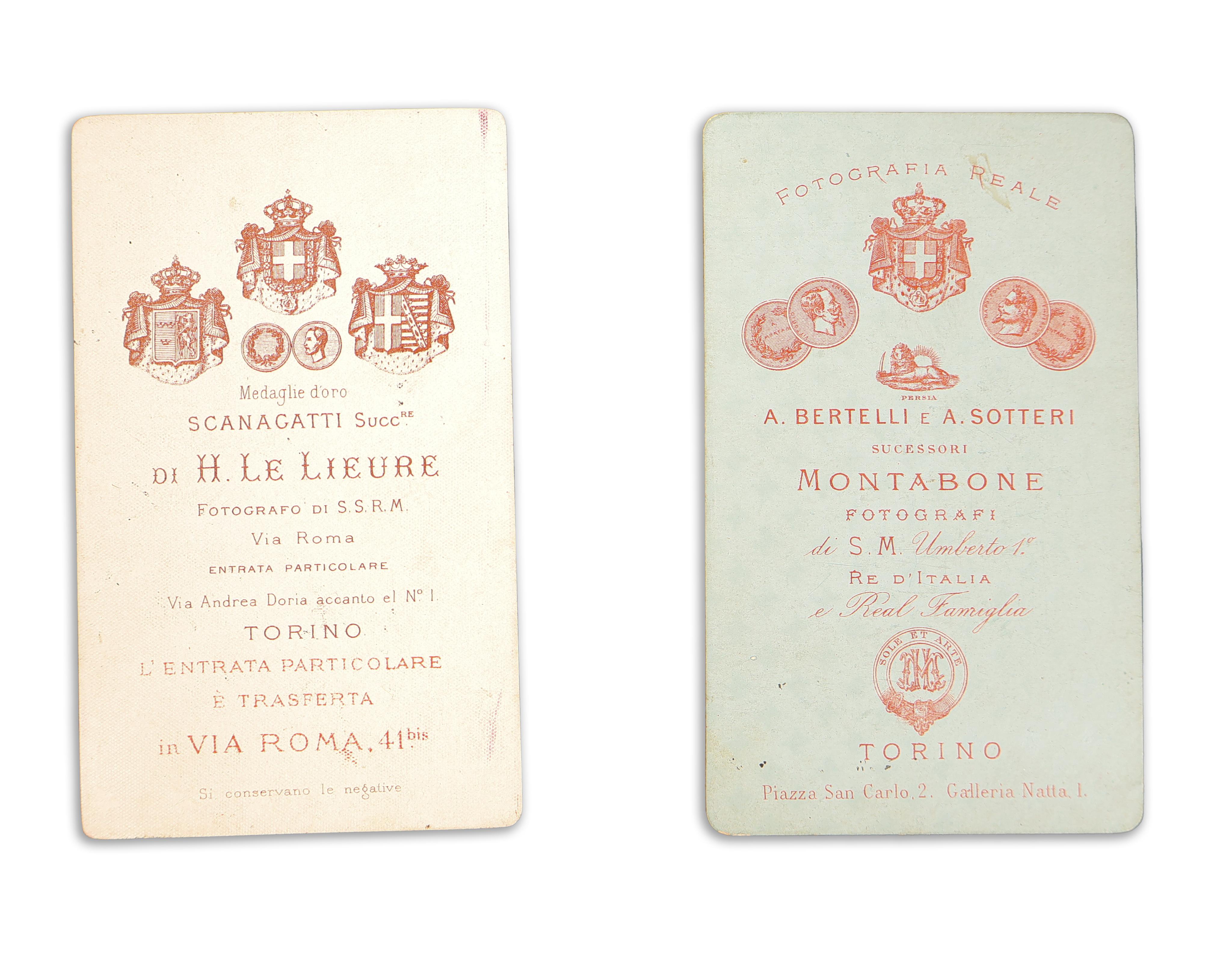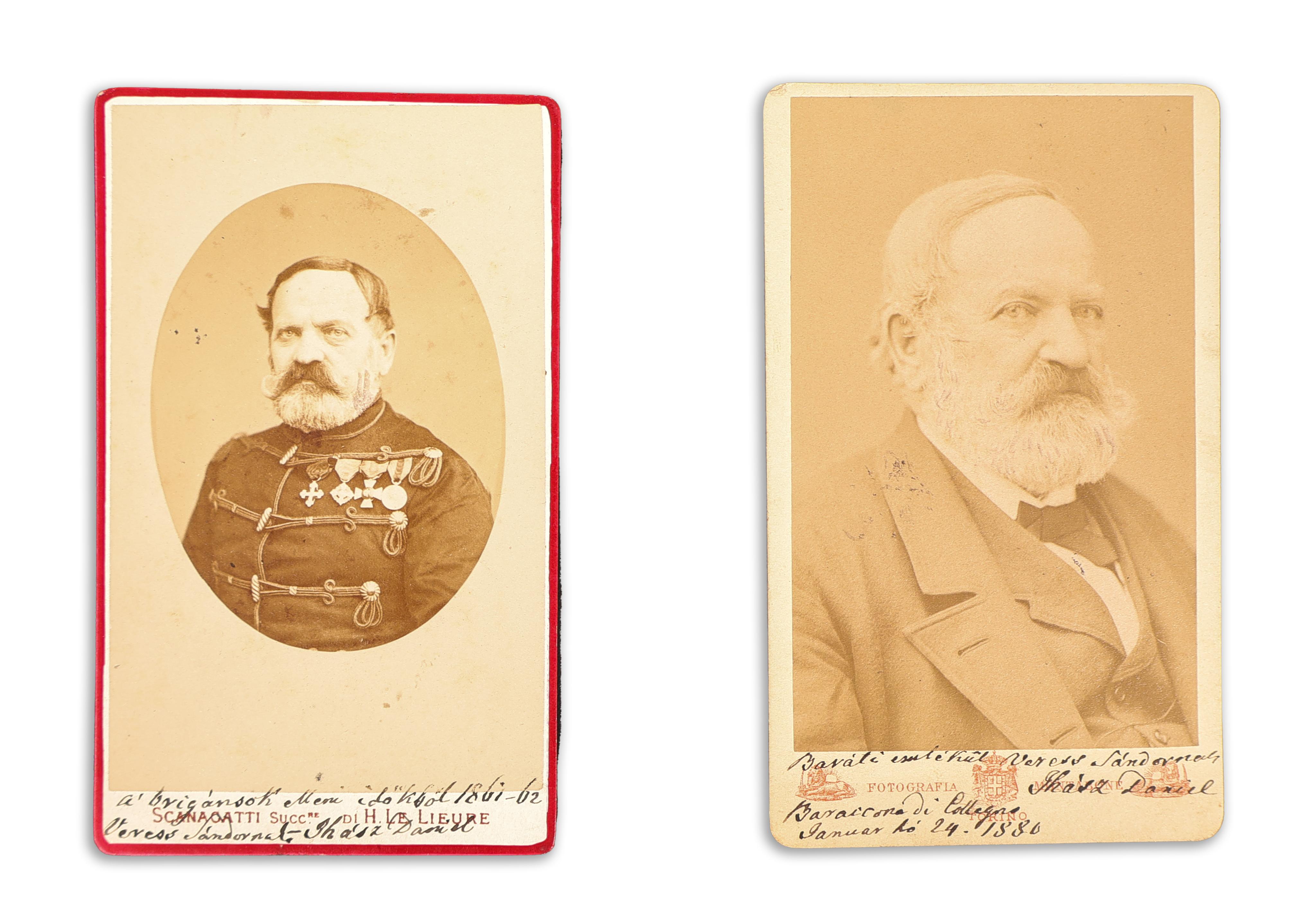 Ihász Dániel (1813-1881, Collegno al Baraccone) colonnello dell'esercito, comandante della legione ungherese in Italia, colonnello dell'esercito italiano, segretario personale di Lajos Kossuth, foto di due biglietti da visita dedicati. Due documenti fotografici eccezionali, entrambi in ottime condizioni.