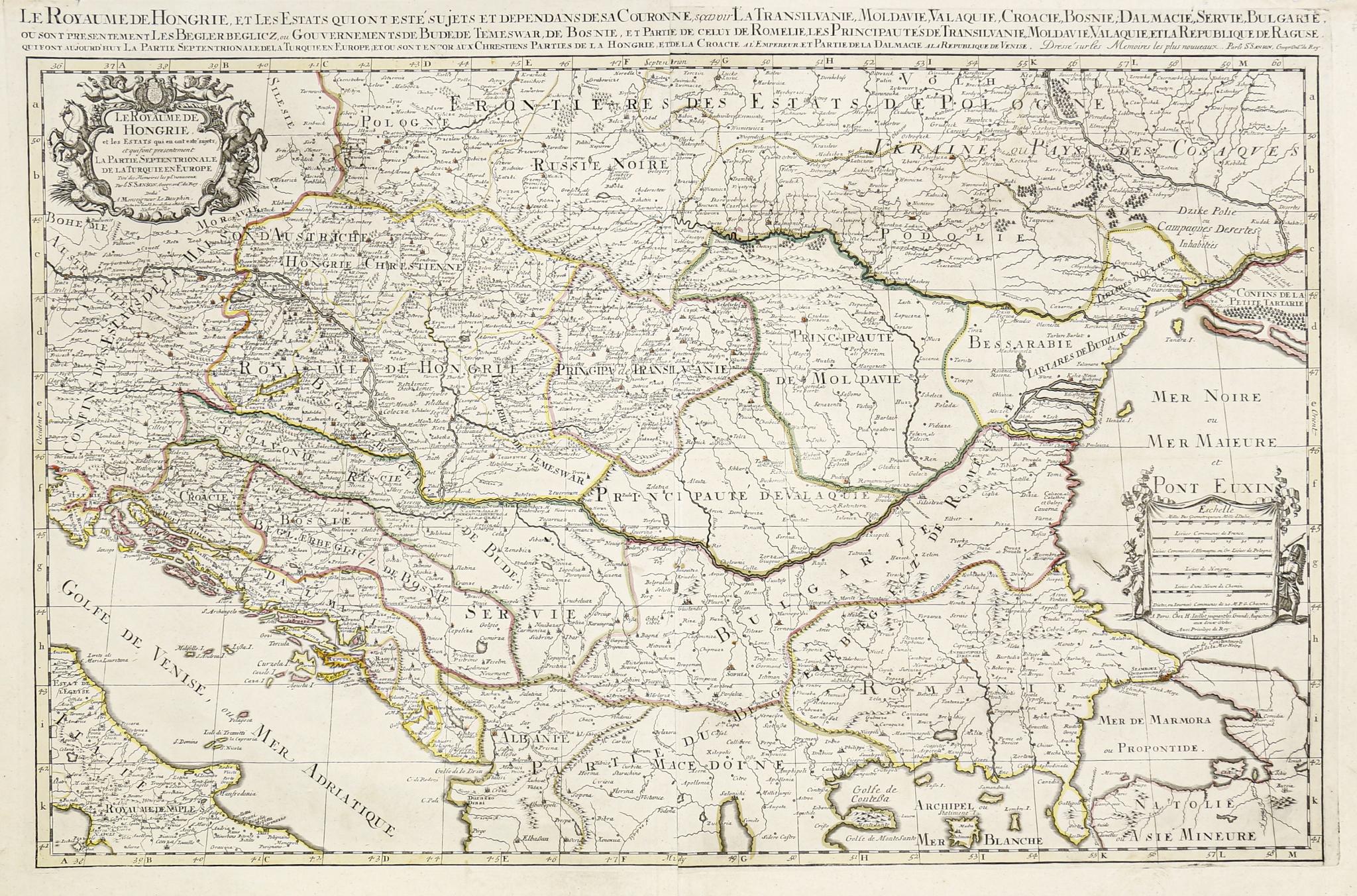 Striking large and highly detailed map of the Hungary, Austria, Poland, Transylvania, Moldovia, Bessarabia, Romania, Macedonia, Albania, Bulgaria, Bosnia, Croatia, Serbia, Dalmatia, Slovenia, the Ukraine and the Adriatic and Black Sea Region, with two Large decorative cartouches. A fine example with wide, clean margins. From Jaillot's monumental atlas.
