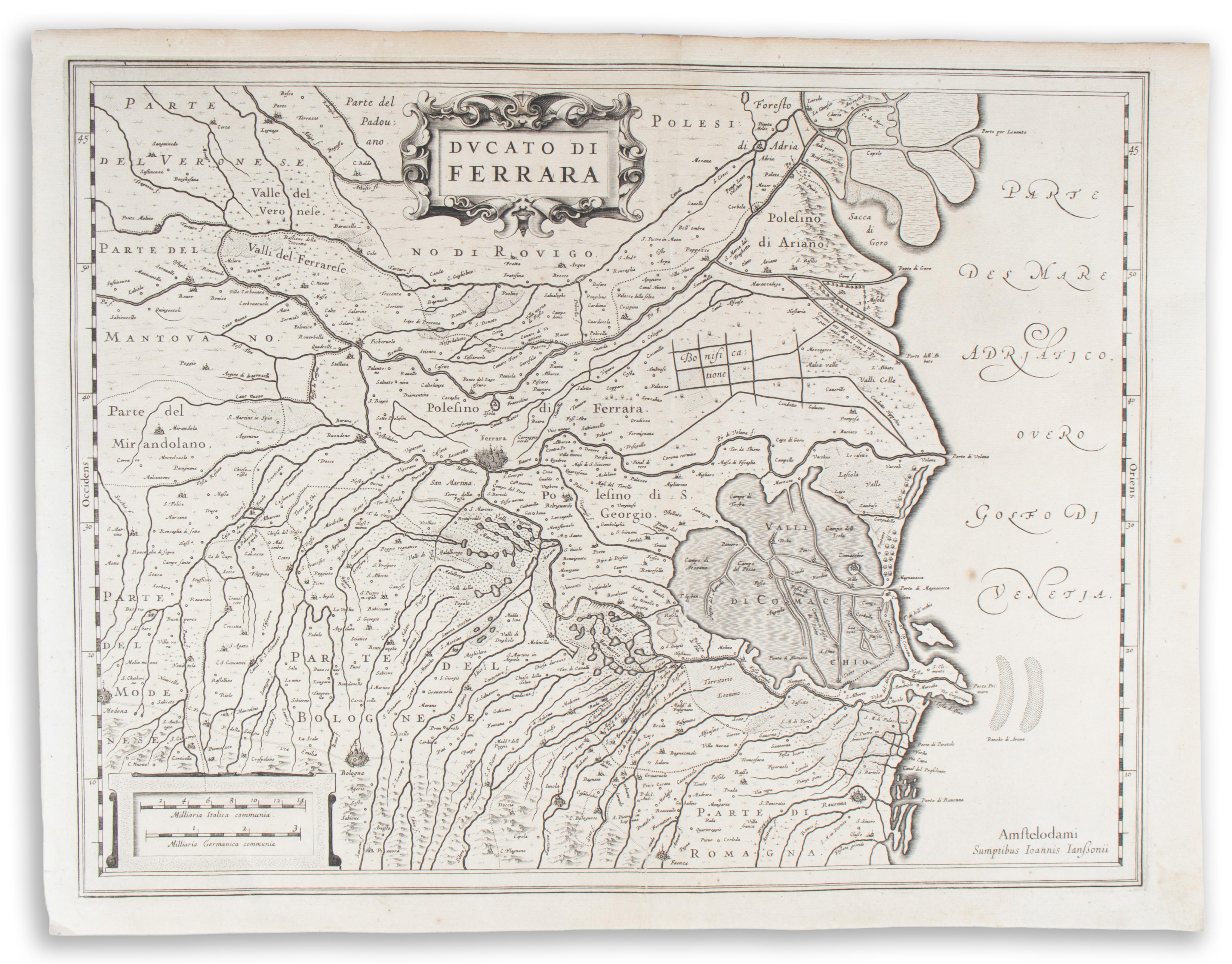 Antique copper engraving map of the Ferrara region, includng the towns of Ferrara and Bologna.