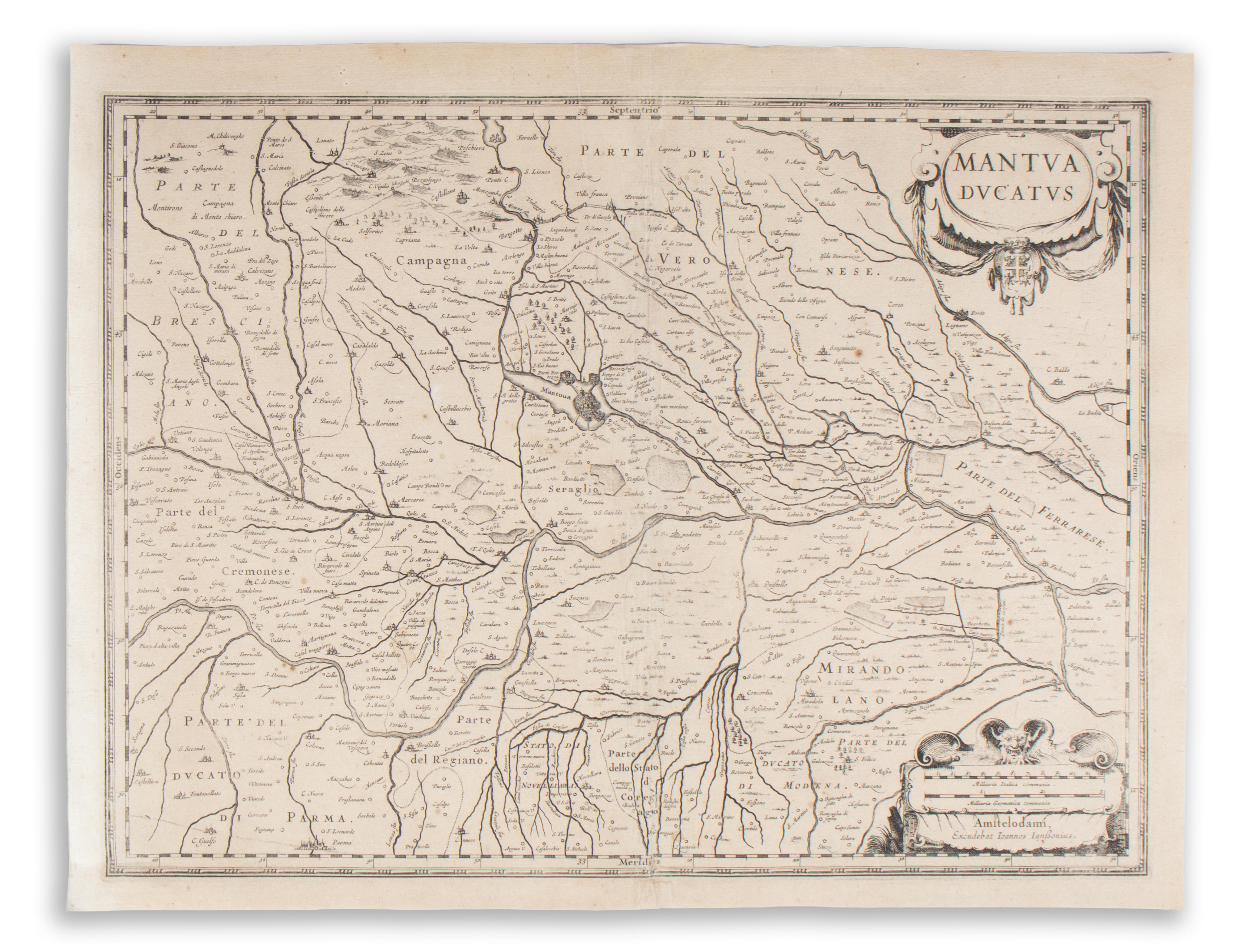 Janssonius részletes térképe, Mantua (Mantova) városával a középpontban, rajta többek között Borgetto és Párma. Két díszes kartussal.
