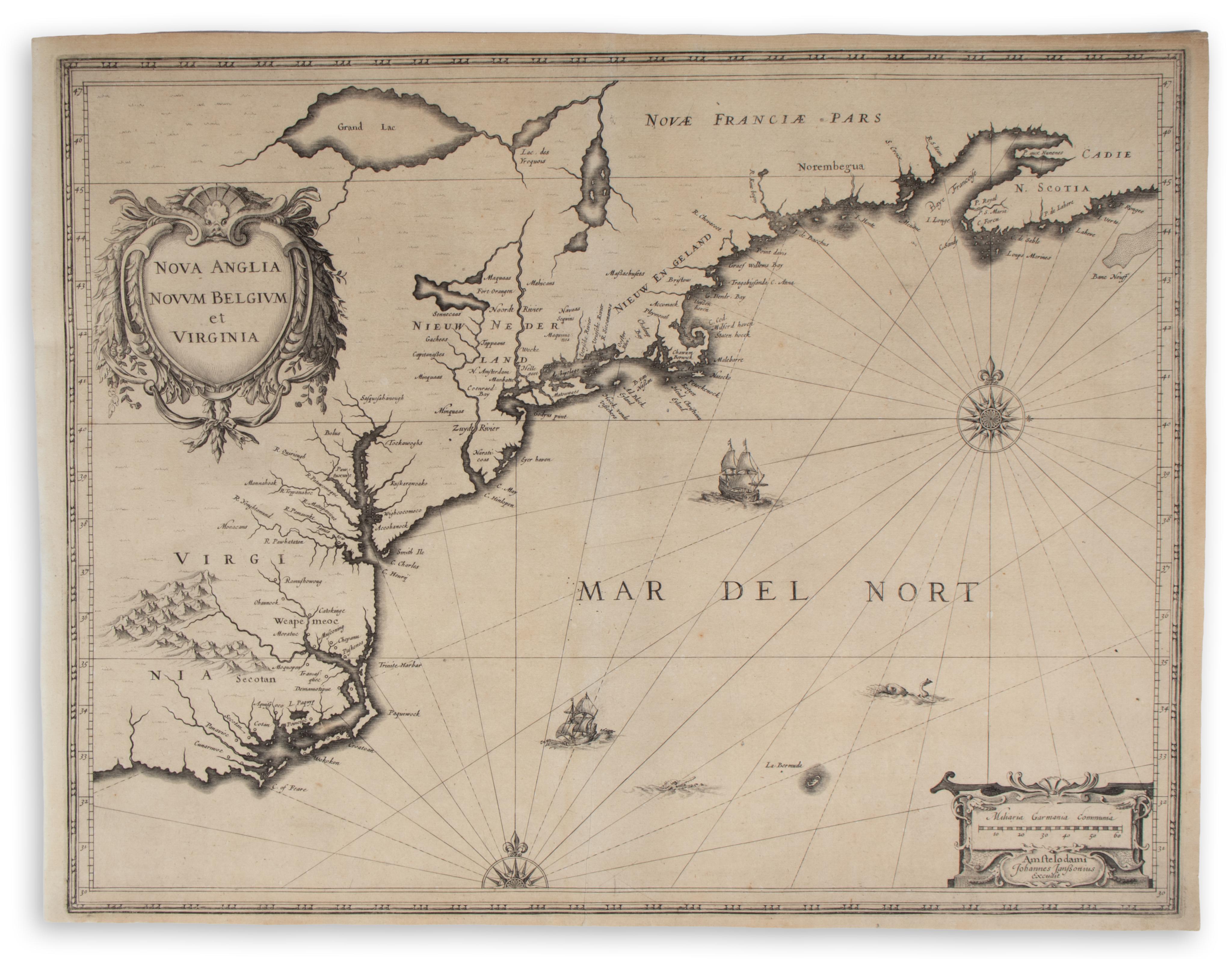 A copperplate map of the eastern coast of North America, from Nova Scotia to Virginia, by Jan Jansson. The sheet is based on Hessel Gerritsz’s map of 1630, which is considered a milestone in the region’s cartography. It is one of the earliest depictions of the mushrooming Dutch and English settlements – including Manhattan (Manbattes), New York (N. Amsterdam), founded in 1626, Albany (Fort Orangen), and Massachusetts – as well as the Great Lakes (Grand Lac and Lac des Yroquois), the Hudson (Noordt Rivier), and the Delaware (Zuyd Rivier) rivers. The engraver illustrated the work with a cartouche inland decorated with plant ornaments, galleys, sea monsters, and compass roses. The piece is particularly rare because of its blank verso. Due to the lack of explanatory text on most copies, it was presumably distributed as a separate sheet or as part of a composite atlas.
