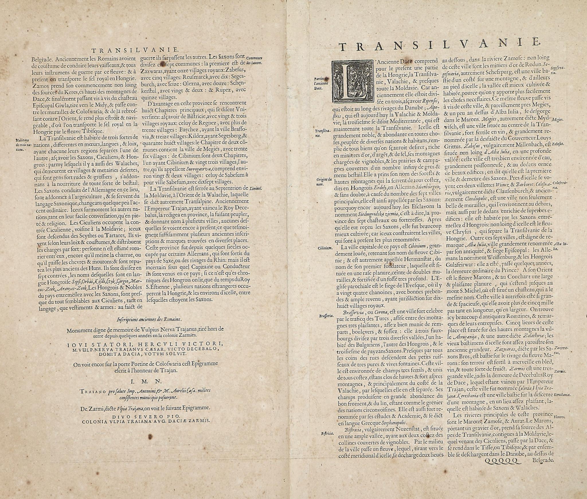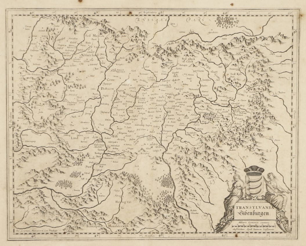 Map of Transylvania published in Amsterdam by Jan Jansson. Based on Gerard Mercator's map of Transylvania of 1595-1602, but with a new cartouche and the Báthori coat of arms. French description on the verso. On the decorated cartouche, on either side of the coat of arms, two women are seated next to a shield decorated with three claws.