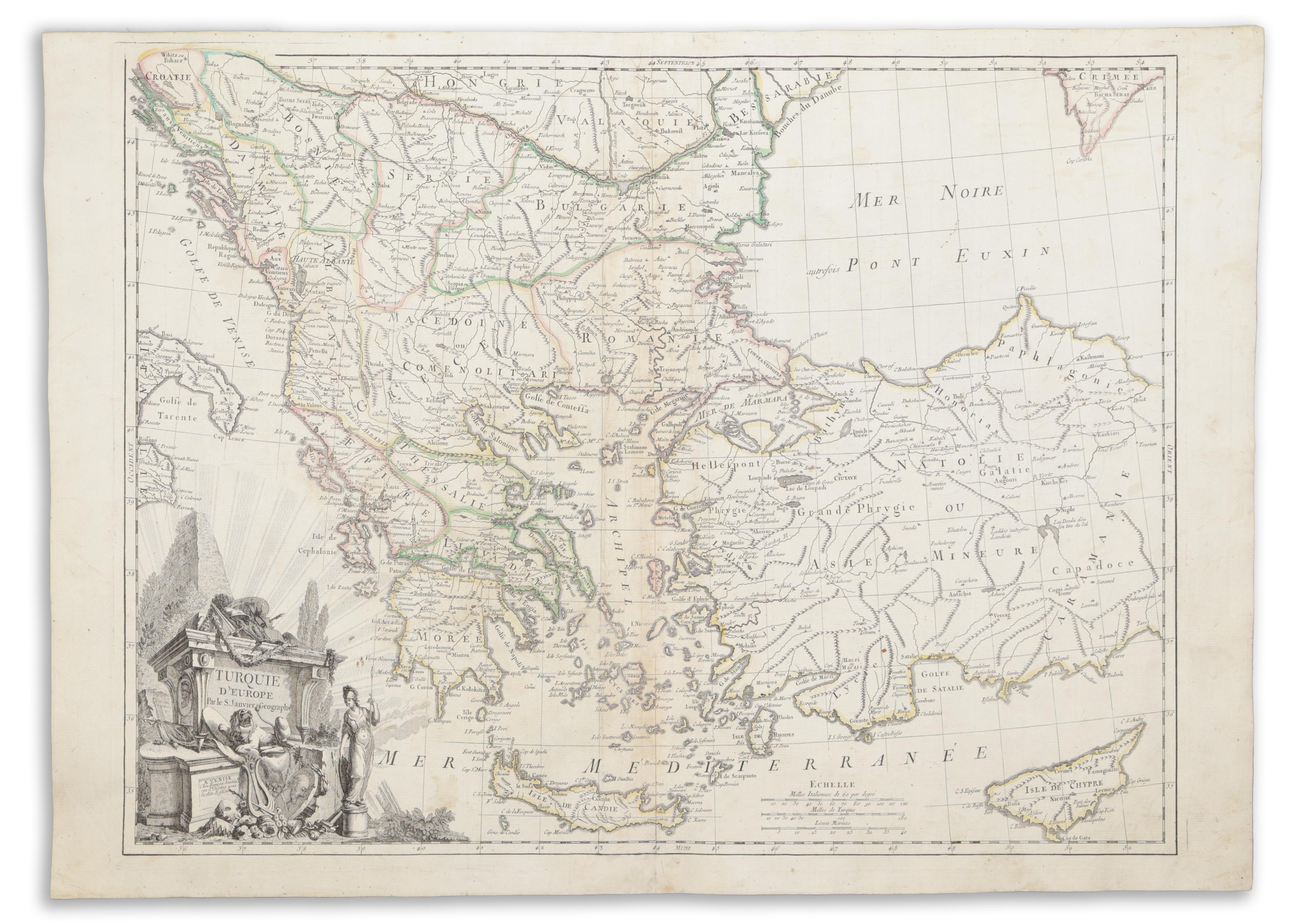 Dekoratív határszínezett rézmetszet. Lapméret: 72×52 cm. In: Jean Lattre-Atlas Moderne ou collection de cartes sur toutes les parties du Globe Terrestre, (23.p.) 1775. Balra lent szép kartussal.
