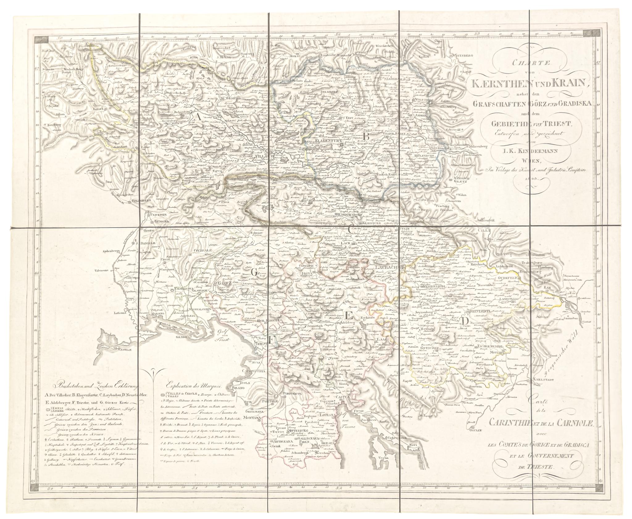 Wien, 1803. Kunst und Industrie Comptoirs.Karintia ritka rézmetszetű, kézzel határszinezett térképe. Rajta: Krajna (Ausztria és Szlovénia történelmi régiója) és Karintia (Ausztria legdélibb tartománya), Isztria egy része, Trieszt környéke, Gorizia és a kis Velenceként emlegetett Grado szerepel rajta. A térkép hangsúlyt fektet a domborzatra és az útkapcsolatokra. Francia cím a jobb alsó sarokban.