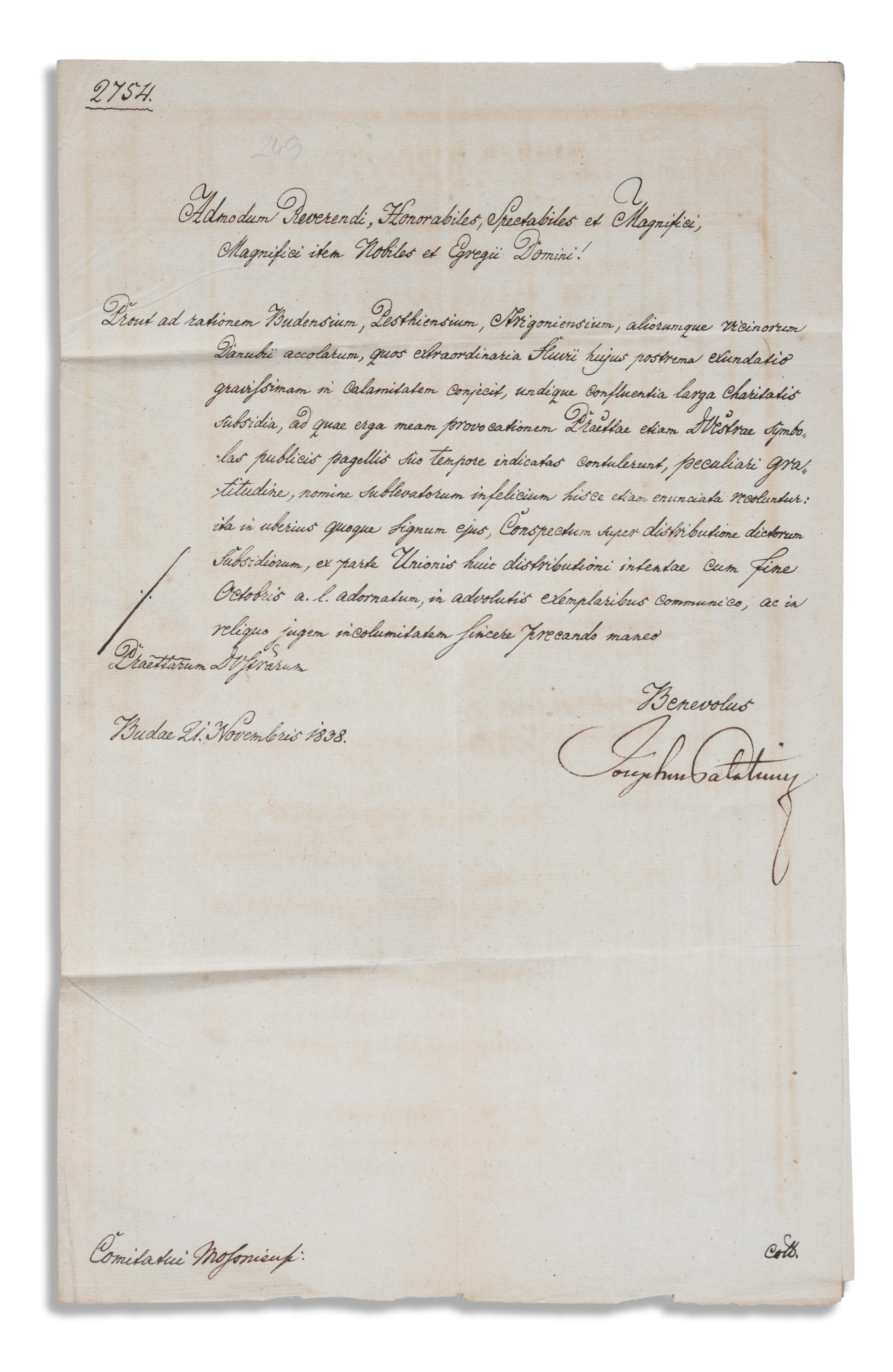 Letter of Archduke Josef of Austria, Palatine of Hungary, written on 21 November 1838, in Buda, in which he thanks the noble community of Moson County for helping the victims of the floods of 1838 of Esztergom and Pest-Buda. The Archduke chaired the Building Committee that inspected the damaged buildings between 1 April and 14 May, and during the rest of the year more than third of the affected houses were repaired.