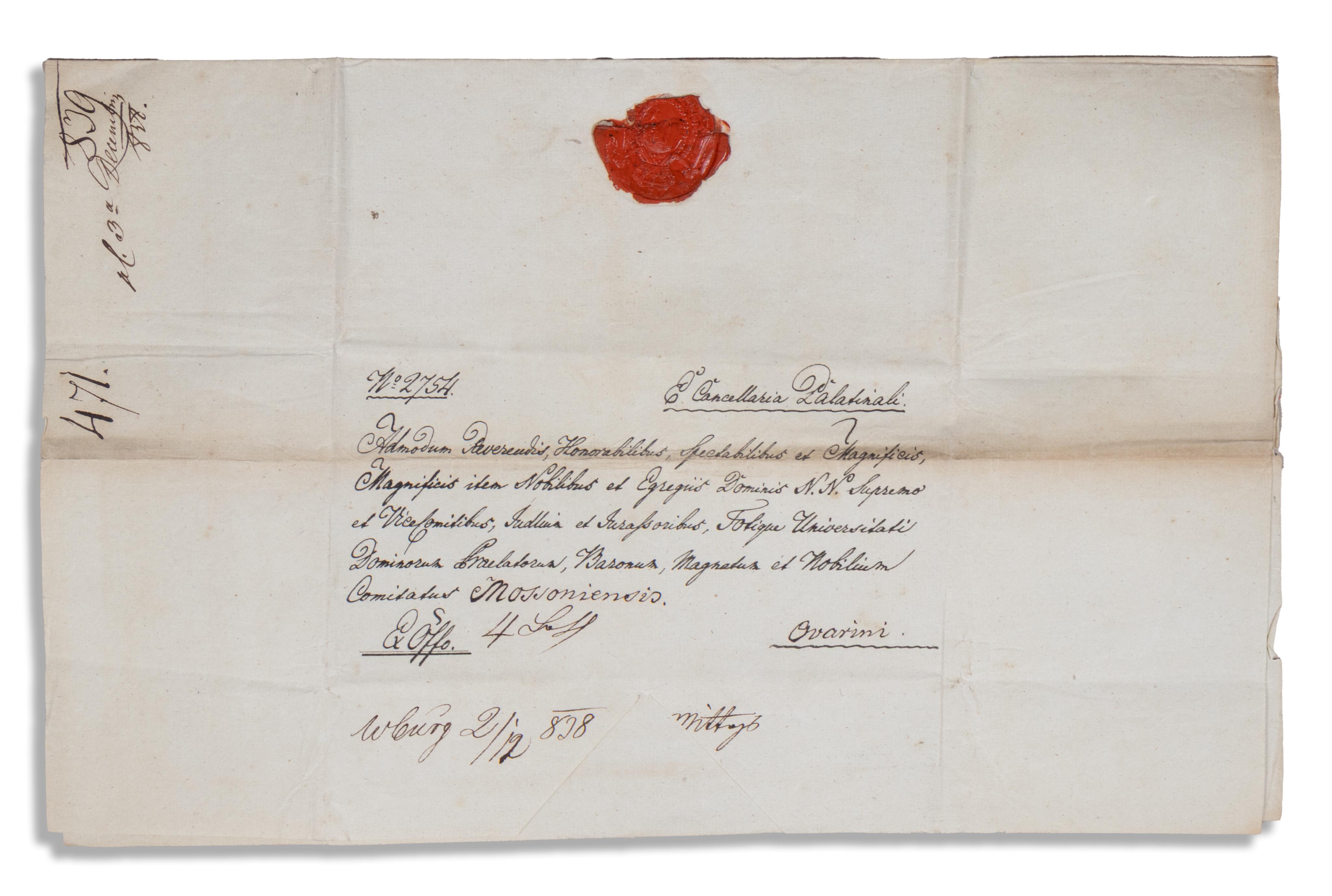 Papír, latin nyelven, József nádor aláírásával, külzetén címzés és címeres rányomott viaszpecsét.