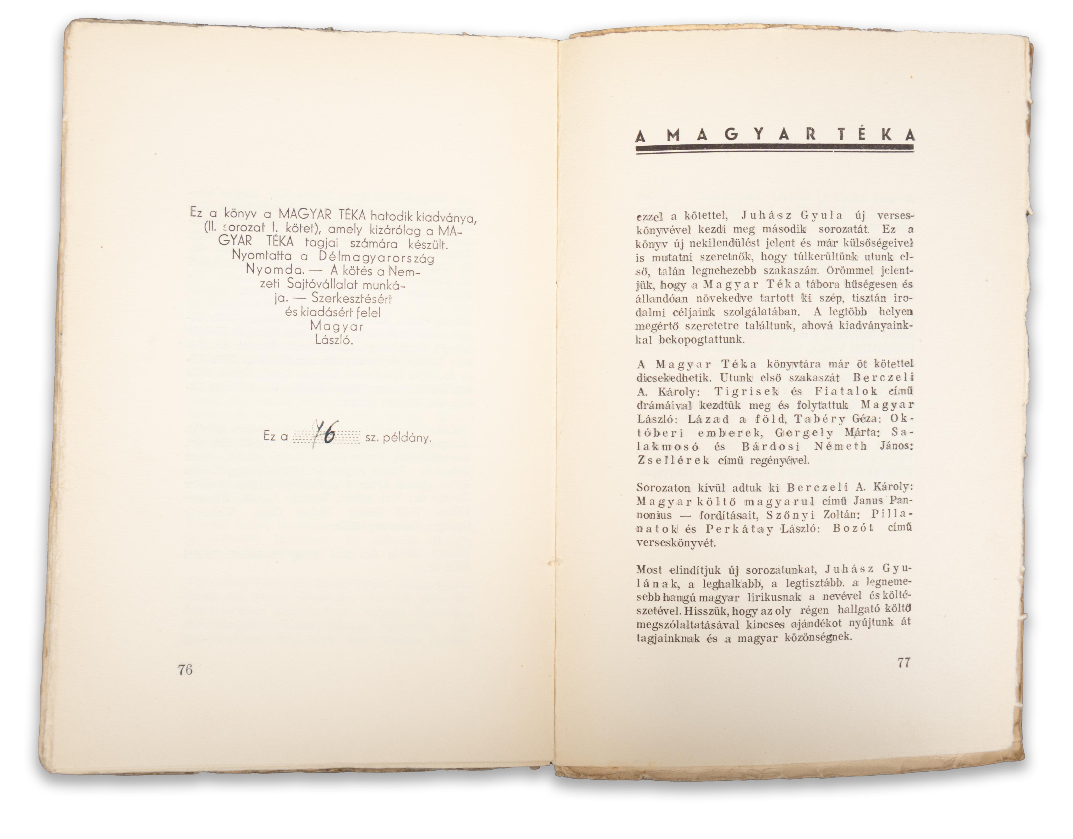 A költő életében megjelent utolsó kötete, barátai a tudta nélkül adták ki. A Magyar Téka tagjai számára készült.