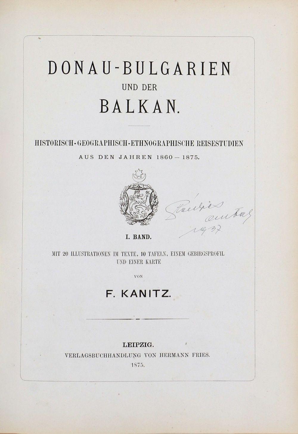 Kanitz Fülöp Félixet, (1829–1904) magyar származású osztrák művészettörténészt, térképészt, régészt és etnográfust, a Balkánon végzett néprajzi és feltáró munkásságának eredményeként a Balkán Kolumbusza névvel illetik. Az Illustrirte Zeitung munkatársaként bejárta Németországot, ő készítette a korszak leghíresebb eseményeinek legtöbb illusztrációját, illetve az osztrák császári családot is elkísérte felső-olaszországi utazásukra és illusztrálta az erről szóló cikkeket. 1858-ban Montenegróba utazott, az itt készült rajzai etnográfiai szempontból nézve igen becsesek. 1859-ben utazott először Szerbiába, másodszor a következő év tavaszán. Sokszor megfordult a többi balkáni államban is: Albániában, Bosznia-Hercegovinában. Jelen kötet az utazások során gyűjtött anyag és személyes élmények eredményeként született meg. Elsőként adta ki a korszak egyik legalaposabb etnográfiai leírását a dél-szláv népekről, kultúráról és tájról, amelyet a szerző által készített gazdag illusztráció kísért. A harmadik kötet végén lévő térkép az addigi legpontosabb ábrázolás a Balkán Duna menti régiójáról, kartográfiailag önmagában kiemelkedő munka (150×60 cm, 1: 420 000). Poss.: "Pénzes Antal 1937" Pénzes Antal (1895–1984) középiskolai tanár, botanikus és ökológus, a XX. századi magyar botanika egyik kiemelkedő alakja, mindemellett neves könyvgyűjtő. Korabeli díszes félbőr-kötésben. Aranyozott gerinccel és aranymetszéssel. A harmadik kötet javítva.