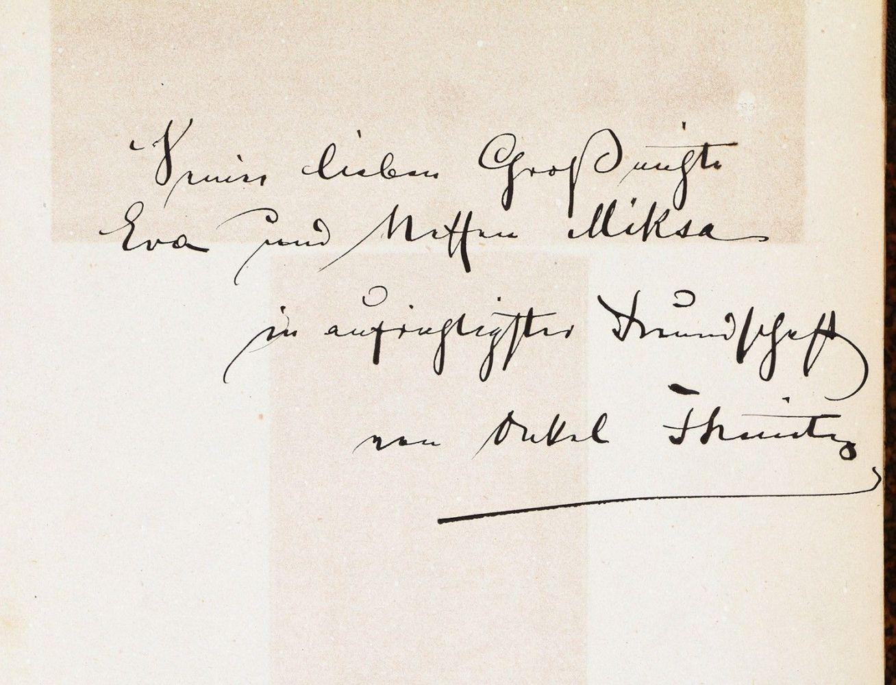 A szerző által rokonainak, Évának és Miksának dedikált példány: „Seiner lieben Großnichte Eva und Neffen Miksa in aufrichtigster Freundschaft von Onkel F. Kanitz”.