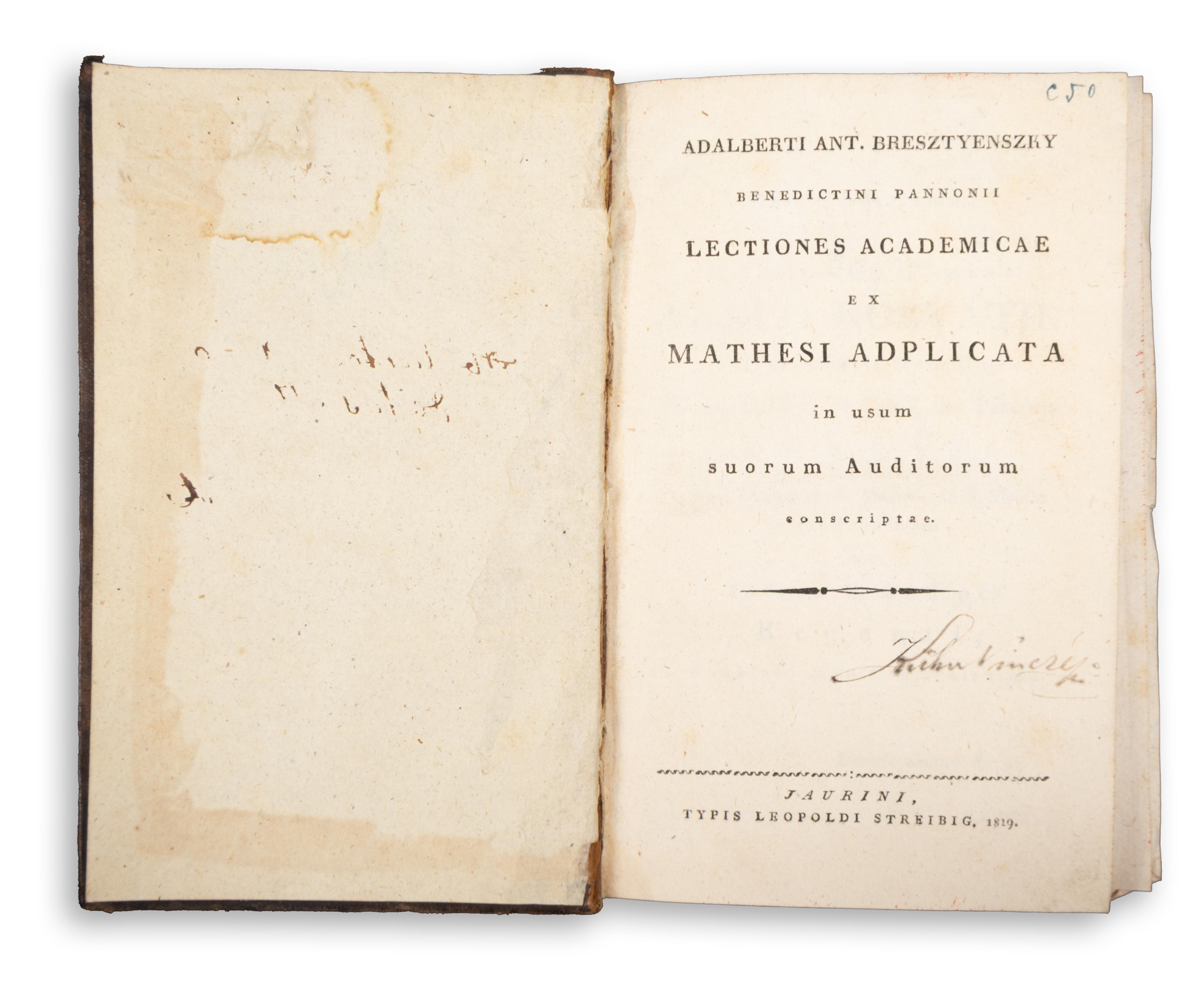 Bresztyenszky Adalbert Antal: Lectiones academicae ex mathesi adplicata in usum suorum Auditotum conscriptae. Jaurini, [Győr] 1819, Leopoldi Streibig. VIII + 160 p. + 4 kihajtható rézmetszet. Korabeli kartonkötésben, a gerincen címke. Címlapon névbeírás.