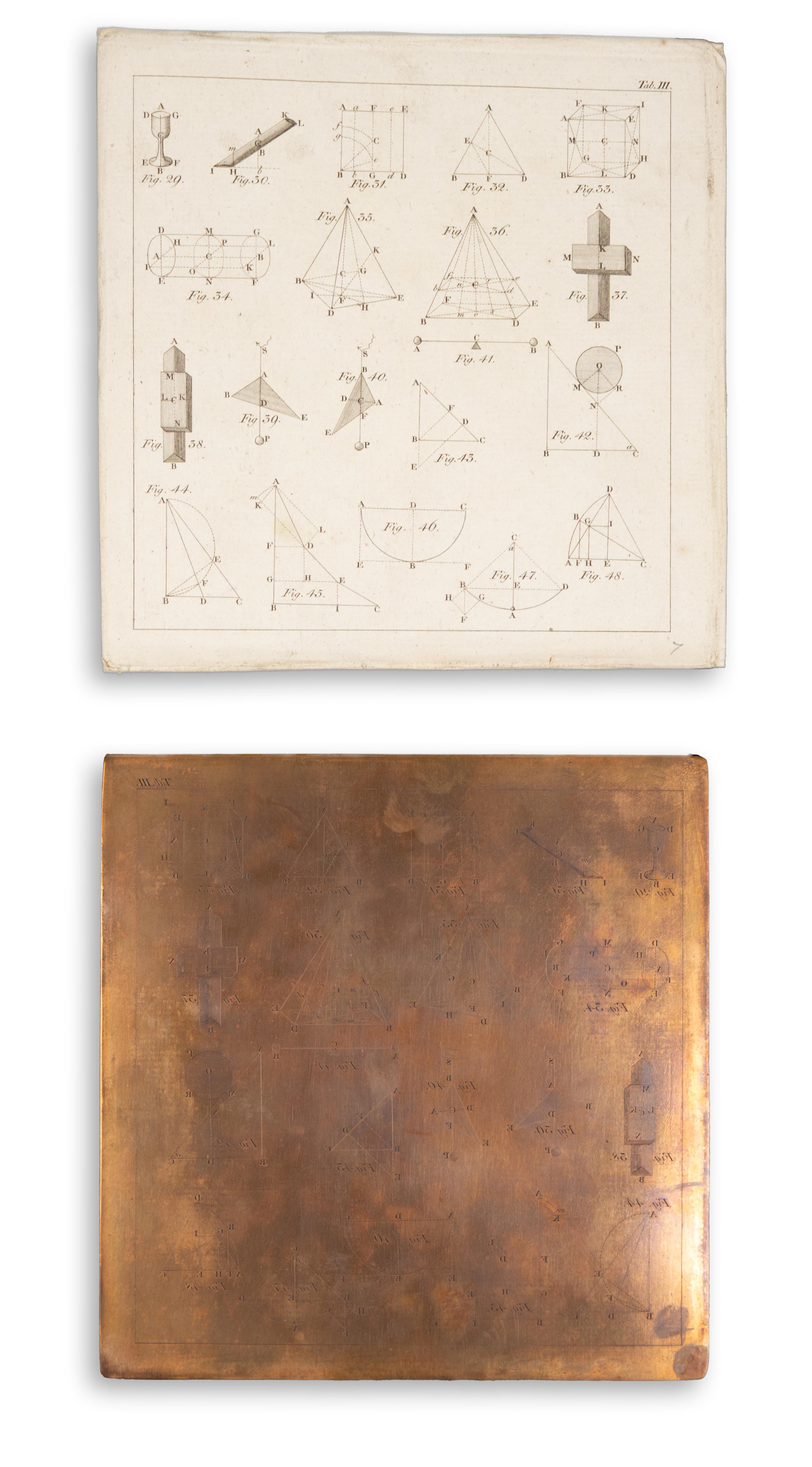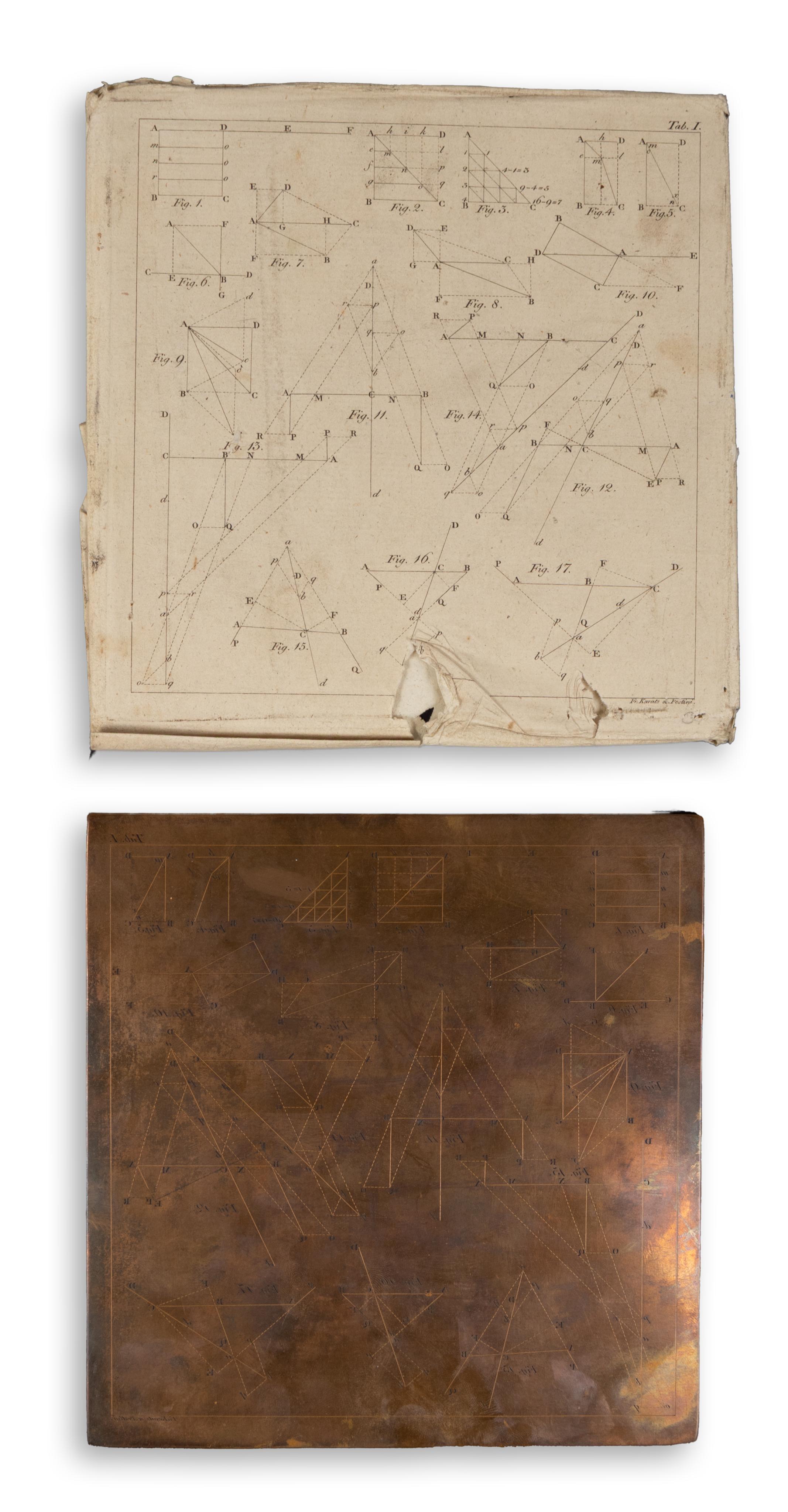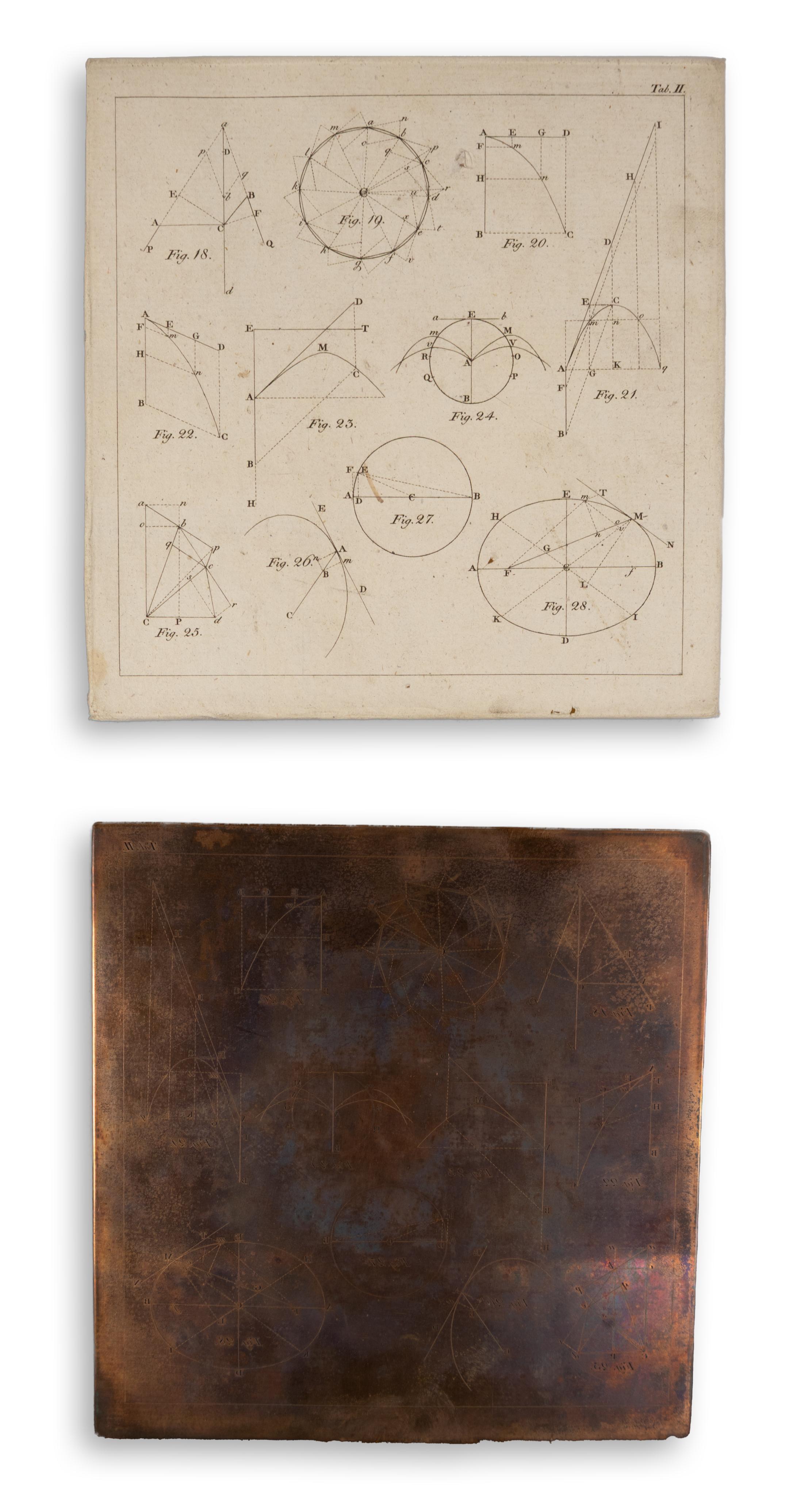 Copper printing plate made by Ferenc Karacs with 4 mathematical algebraic figures. Enclosed is the book in which they were published.