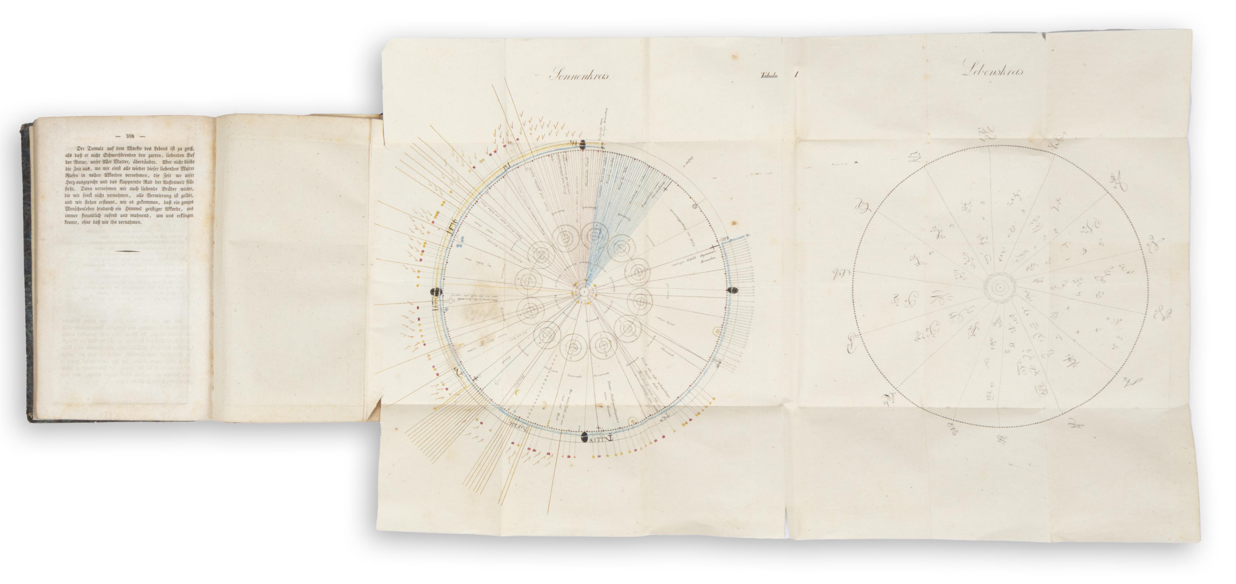 The first volume contains 8 multiple-folded plates in the appendix, showing astrological diagrams (“sun circles”), samples of the medium's secret writing, and a vivid illustration of her “nerve stimulator” (a so-called “Baquet”).