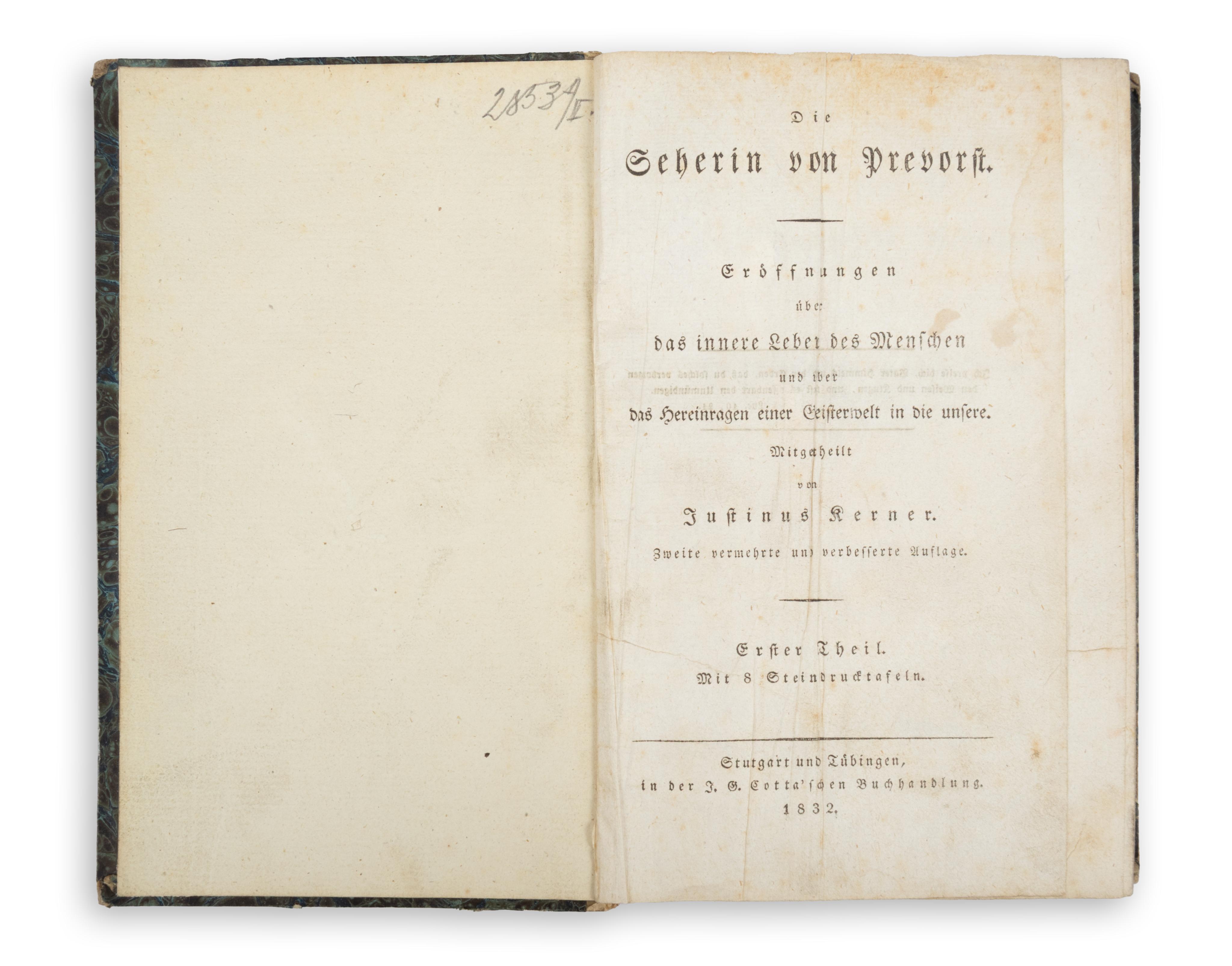 Stutgart - Tübingen, 1832. Cotta... Eröffnungen über das innere Leben des Menschen und über das Hereinragen einer Geisterwelt in die unsere. [8] + 308 p. + 8 t.; [8] + 324 p.