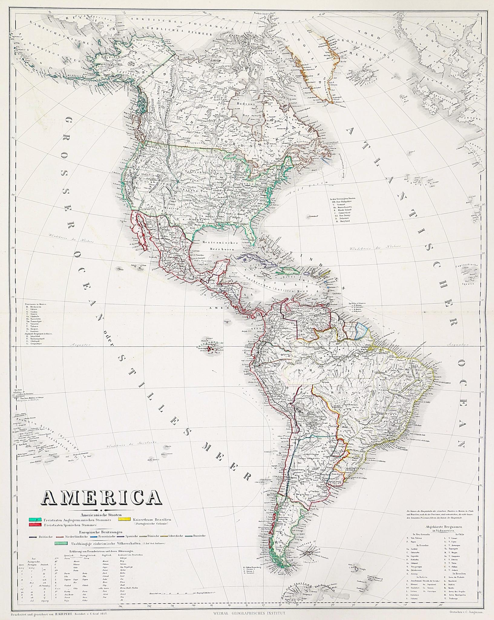 Weimari Földrajzi Intézetet kiadott ritka Amerika-térkép. Földrajzi régiókra tagolódik, az európai gyarmatokat külön színezi. Az amerikai országok a következőképpen vannak kategorizálva: Angol-germán származású szabad államok, spanyol származású szabad államok és a Brazil Birodalom (portugál gyarmat).