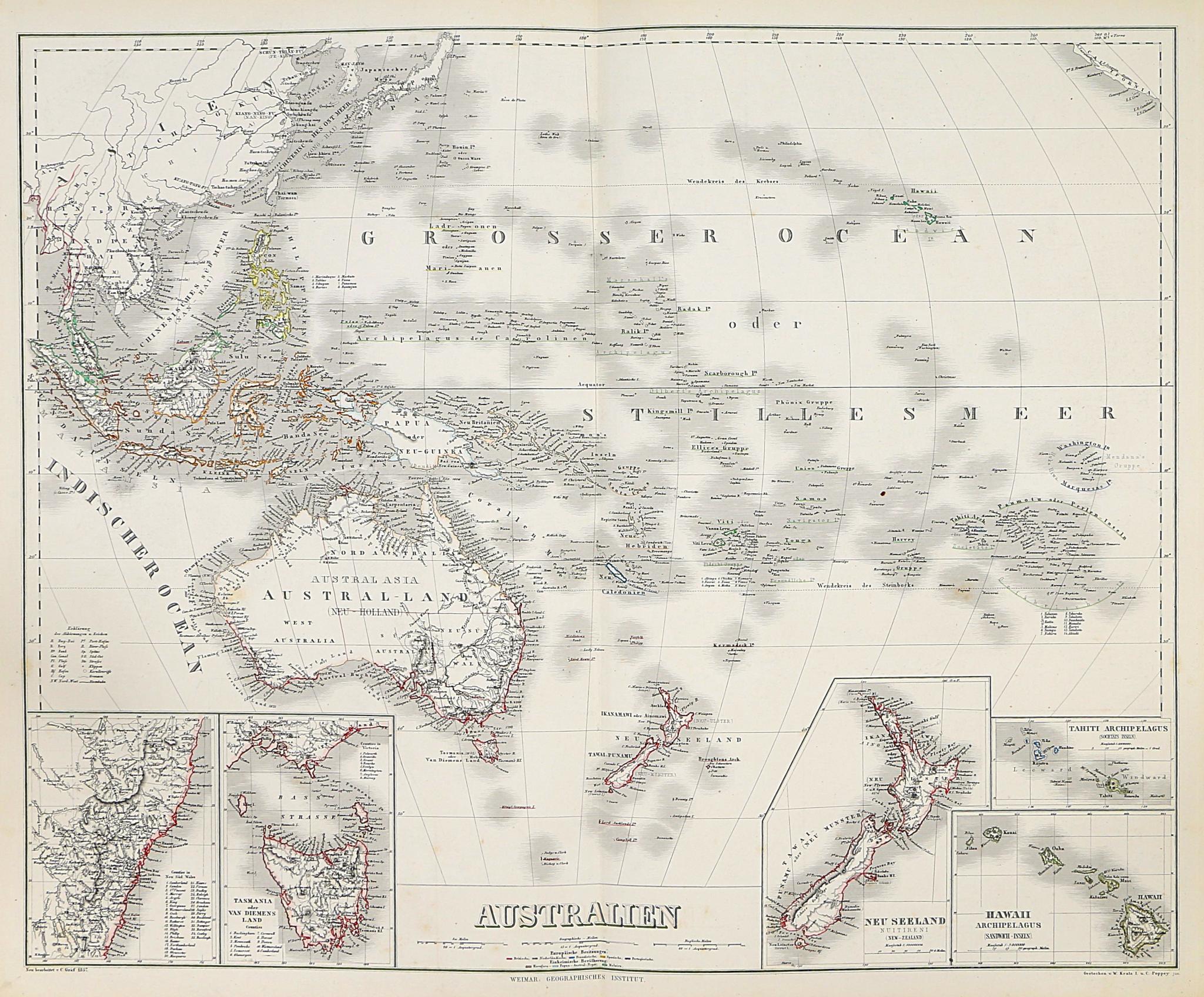 Full Title: Australien. (with New South Wales). (with) Tasmania oder Van-Diemens Land. (with) Neu Seeland, New-Zealand. (with) Hawaii Archipelagus, Sandwich-Inseln. (with) Taheiti Archipelagus, Societats Inseln. Gezeichnet v. H. Kiepert. Gest. v. C. Kratz. Weimar, geographisches Institut, 1856.
