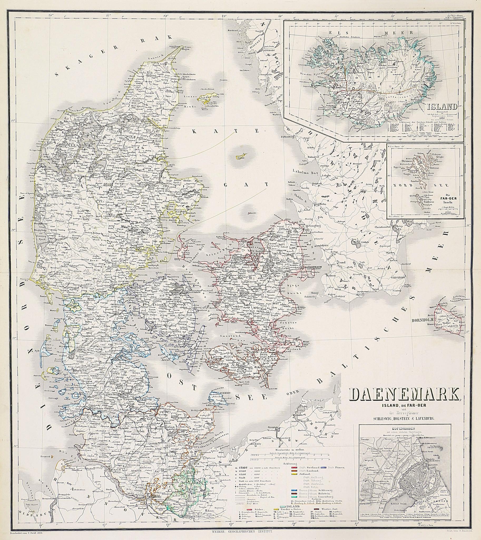 Dánia határszínezett térképe, három további térképpel Izlandról, a Feröer-szigetekről és Koppenhága tervével. A határszínezéssel Sjælland, Fyn, Lolland és a Schleswig, Holstein és Lauenburg hercegségek láthatók. Mutatja a városokat és településeket, utakat, vasutakat, folyókat, csatornákat stb. Tartalmazza a legendát és a rövidítést. A domborzat sraffírozással jelölve. A fő meridiánok a Ferro és a Paris.