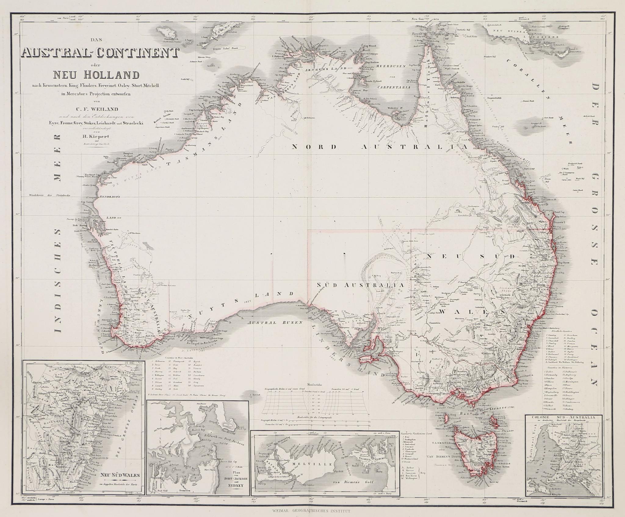 Das Austral-Continent oder Neu Holland nach Krusentern, King, Flinders, Freycinet, Oxey, Sturt, Mitchell in Mercator's Projection entworfen von C.F. Weiland und Eyre, Frome, Grey, Stokes, Leichardt, und Strzeliecki . . . 1858