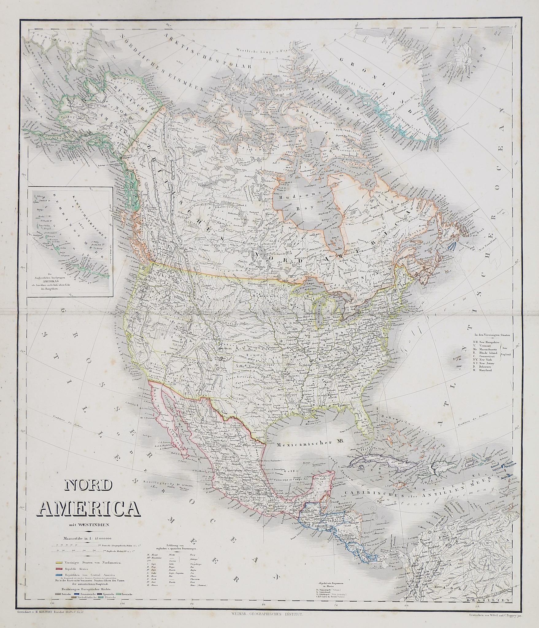 A weimari Földrajzi Intézet által kiadott térkép részletesen ábrázolja a 19. század közepén Franciaország, Oroszország, Nagy-Britannia, Spanyolország, Dánia és Hollandia, valamint az Egyesült Államok, Mexikó és a rövid életű Közép-Amerikai Szövetségi Köztársaság gyarmati birtokait. Minden politikai egységet külön, kézzel színezett határvonalakkal különböztetnek meg, amelyeket a bal alsó sarokban található mutatóban magyaráznak meg.