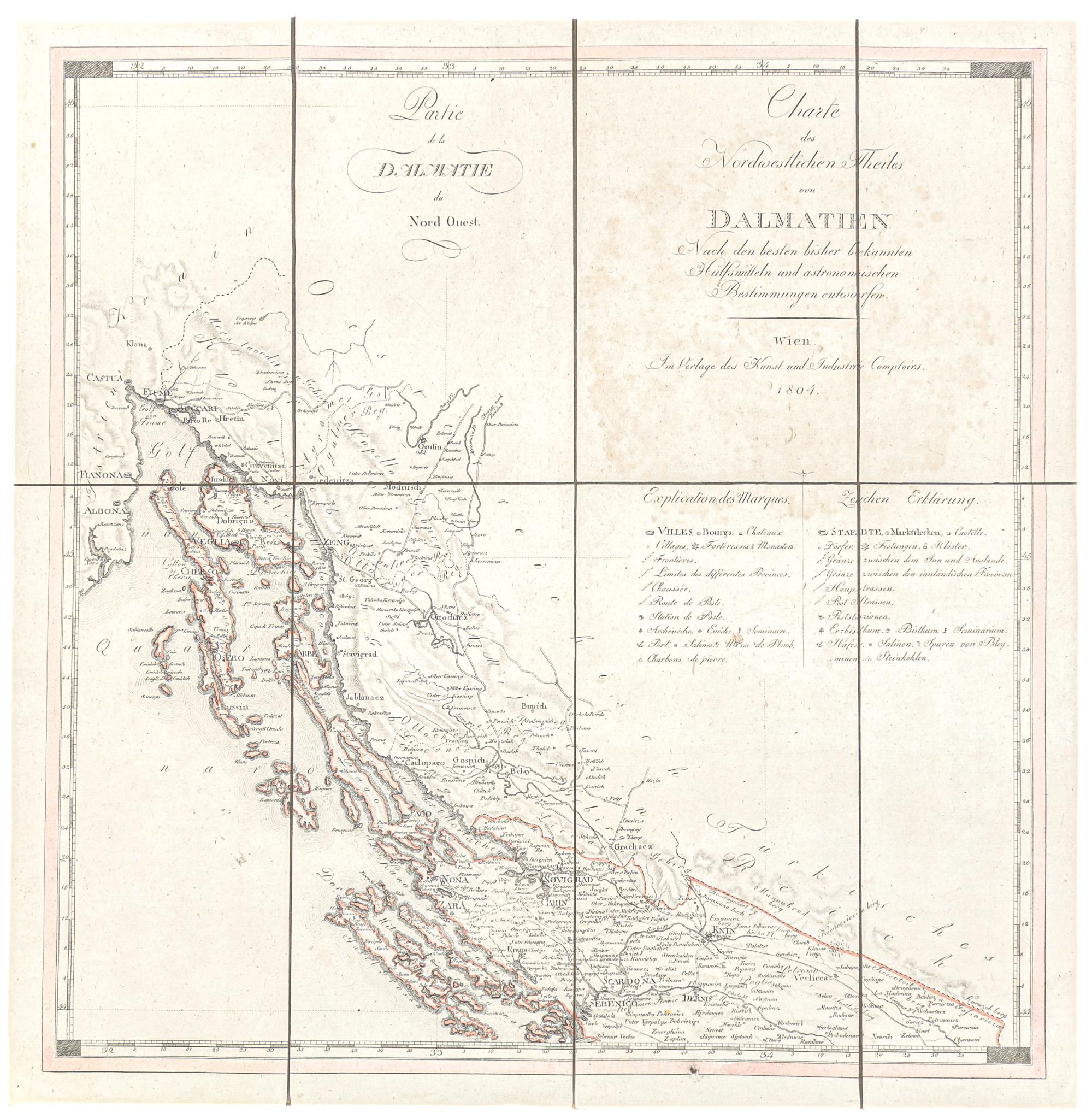 Wien, 1804. Kunst und Industrie Comptoirs.Dalmácia észak-nyugati részeinek ritka, rézmetszetű, kézzel határszinezett térképe. A horvát tengerpartot mutatja be Kelet-Isztriától Šibenikig. A hátországban a zölddel jelölt határ az Osztrák és az Oszmán Birodalom közötti demarkációs vonalat jelzi. A domborzatot árnyékolással ábrázolják, és különösen a Velebit-hegység emelkedik ki. A térkép postai állomásokat és útvonalakat is tartalmaz. Francia cím balra.