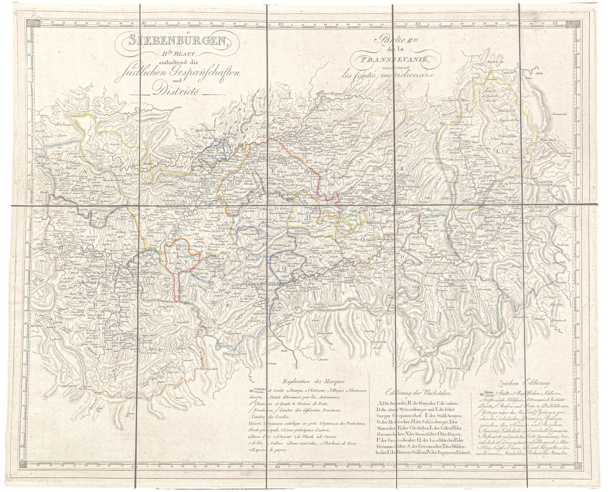 Erdély ritka, rézmetszetű, határszínezett térképe. Rajta: Zaránd, Hunyad, Gyulafehérvár, és Küküllővár községek, valamint Aranyosszék, Medgyes, Segesvár, Maros, Nagyszeben, Brassó, Reps, Leschkirch és Fogaras városok. Francia cím jobbra fent.