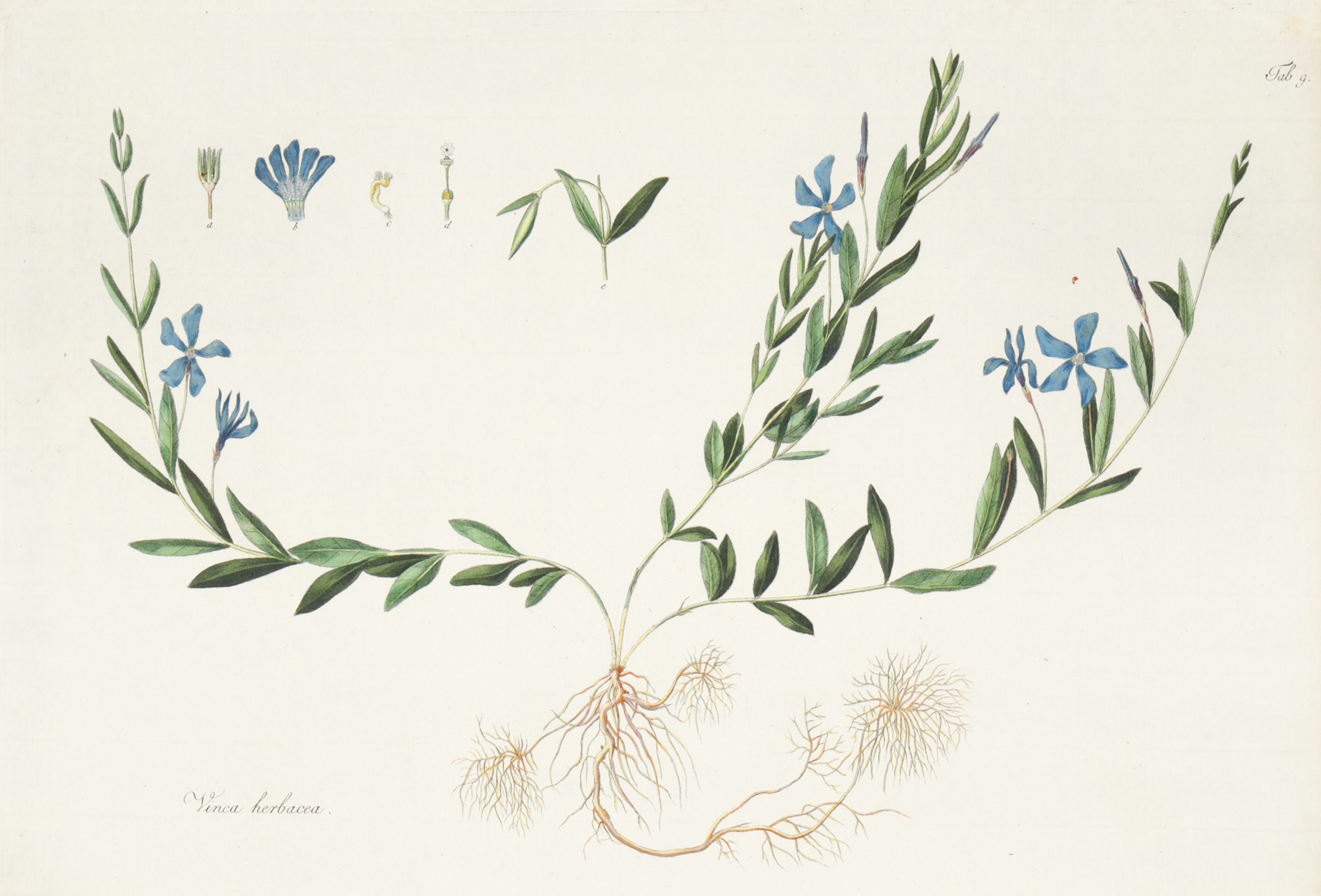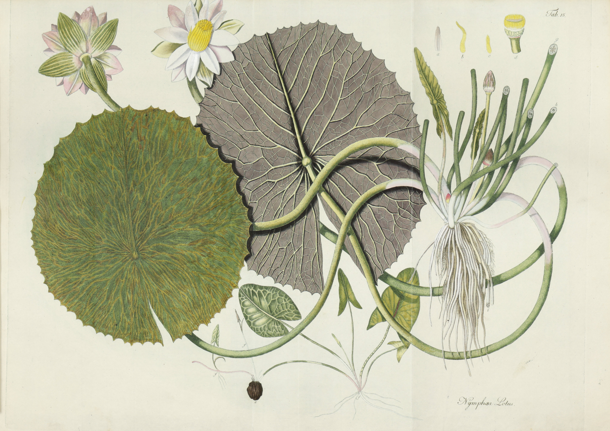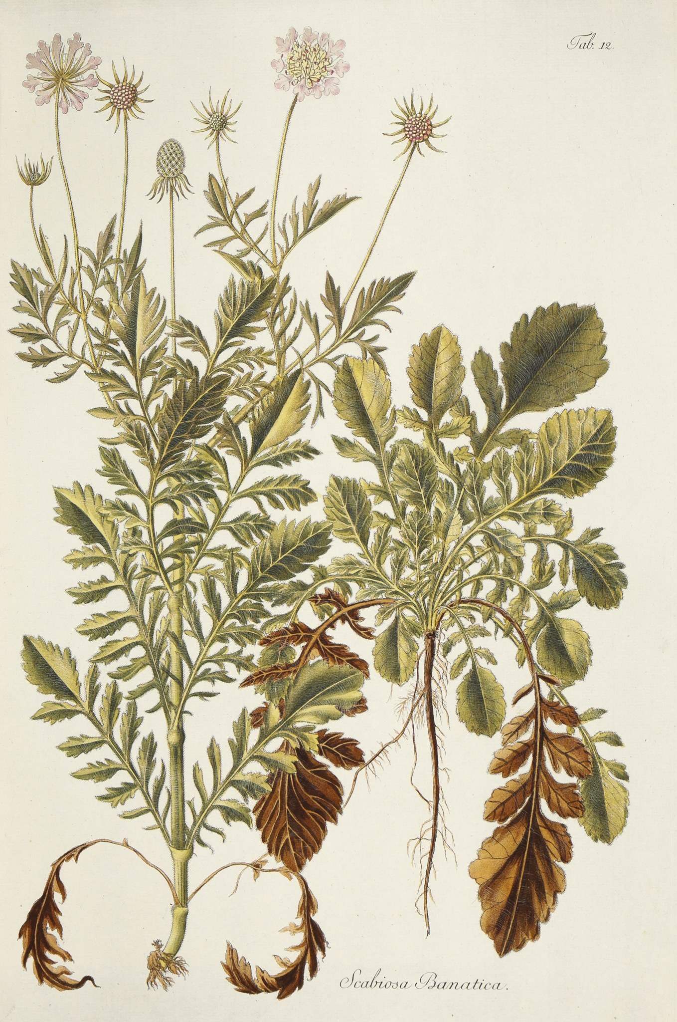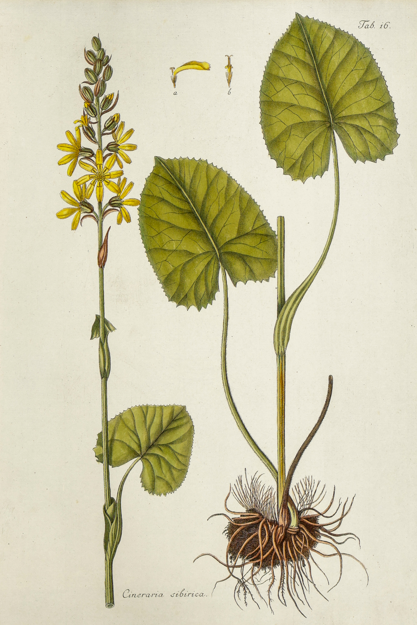 18 egymást követő, kézzel színezett rézmetszet az első kötetből, ebből 1 kihajtható. A levelek jobb felső sarkában számozás, lent a növény latin megnevezése. Mindegyik szép, tiszta állapotban, többségében hártyapapírral védve. Lapméret: 46×33 cm.