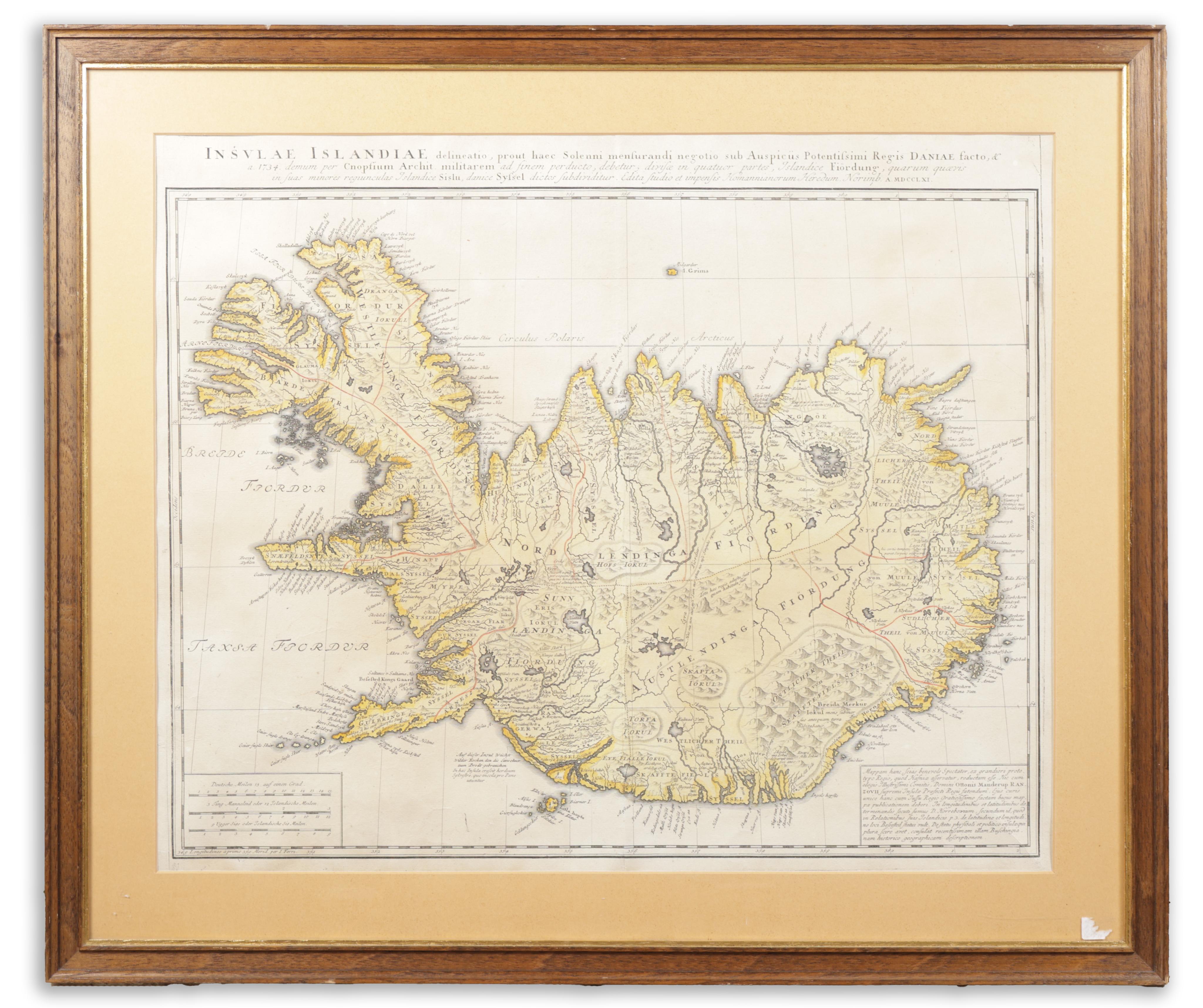 Korai, igényesen színezett térkép Izlandról, Th. H. Knoff és O. Ranzow készítésében, a Homann örökösök kiadásában. Ez a térkép tudományosabb alapokon nyugszik, mint sok korábbi hasonló változat. Számtalan vulkánt ábrázol, amelyek közül sok név szerint is szerepel, csakúgy, mint az ország számos fjordja.