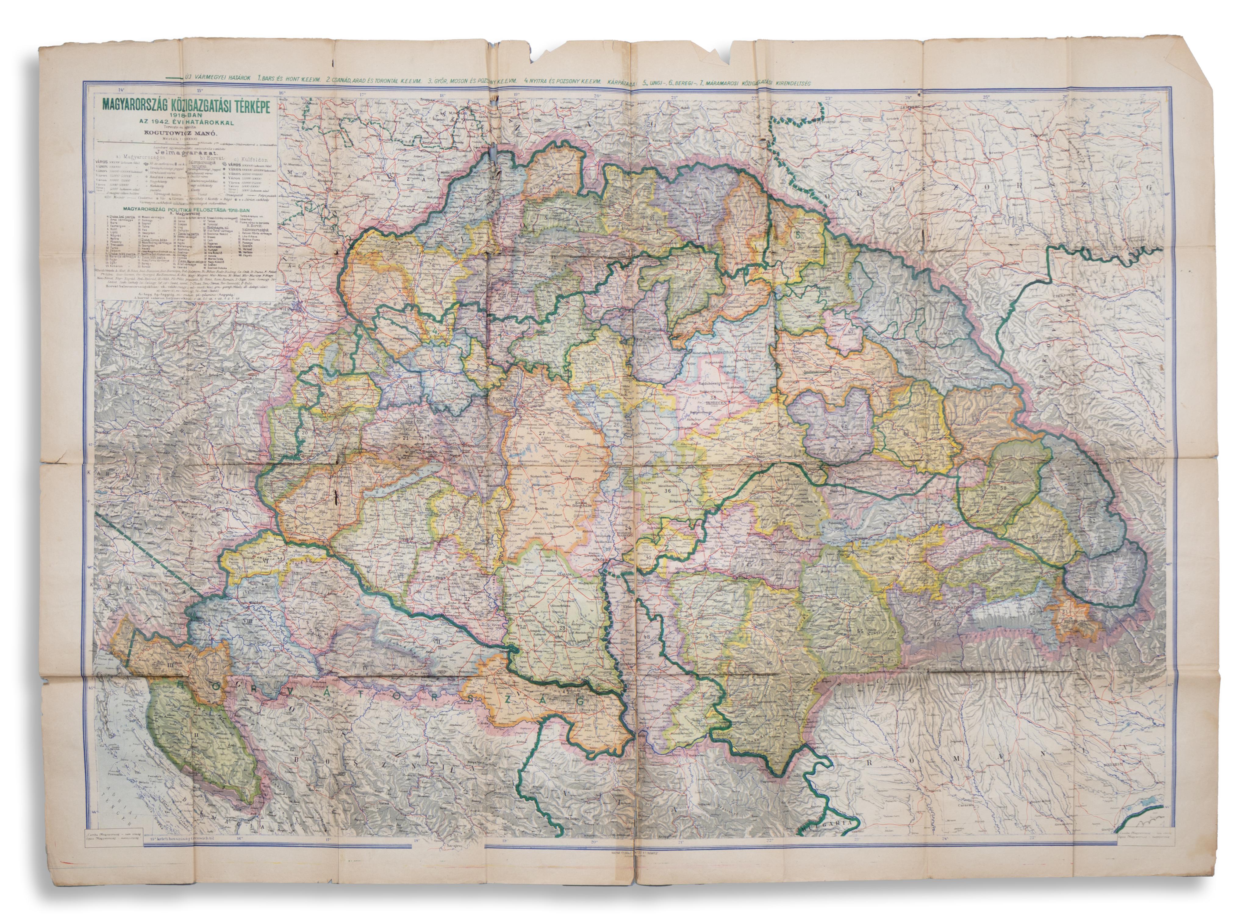 Administrative map of Hungary in 1918 with the borders of 1942. Folded, some small holes and tears at the folds.