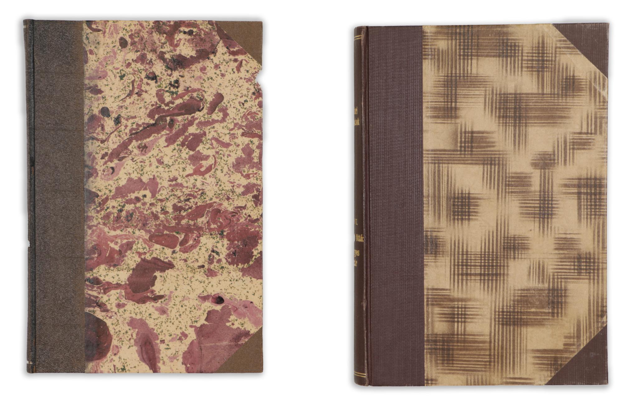Egységes, korabeli félvászonkötésben, kivéve XI. kötet táblái, amely márványozott díszítésűek.