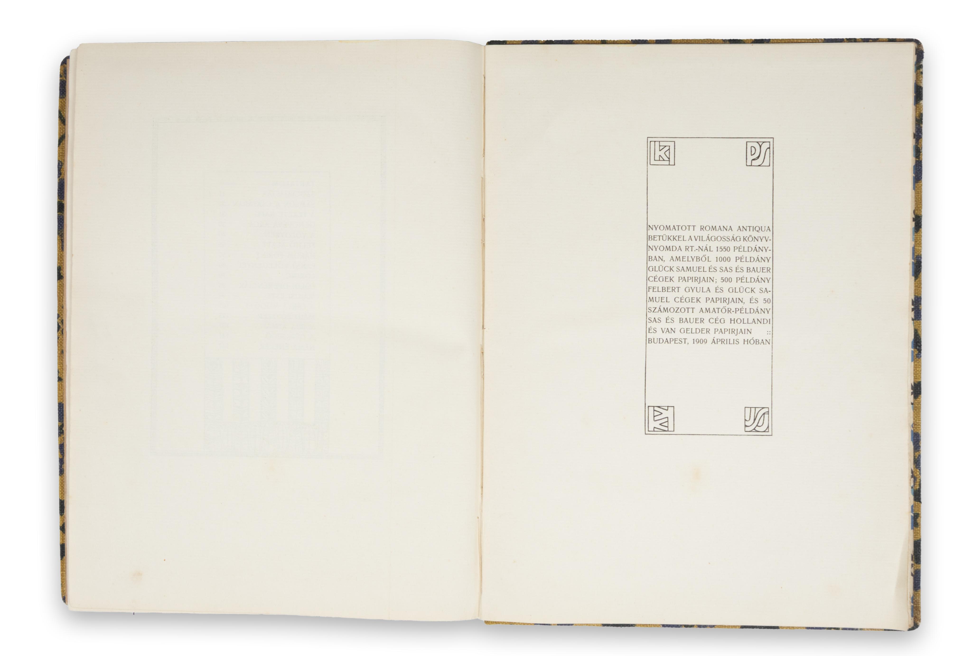 Kolofon: „Nyomatott Romana Antiqua betükkel a Világosság Könyvnyomda Rt.-nál 1550 példányban, amelyből 1000 példány Glück Samuel és Sas és Bauer cégek papírjain; 500 példány Felbert Gyula és Glück Samuel cégek papírjain, és 50 számozott amatőr-példány Sas és Bauer cég Hollandi és van Gelder papírjain. Budapest, 1909. április hóban.”