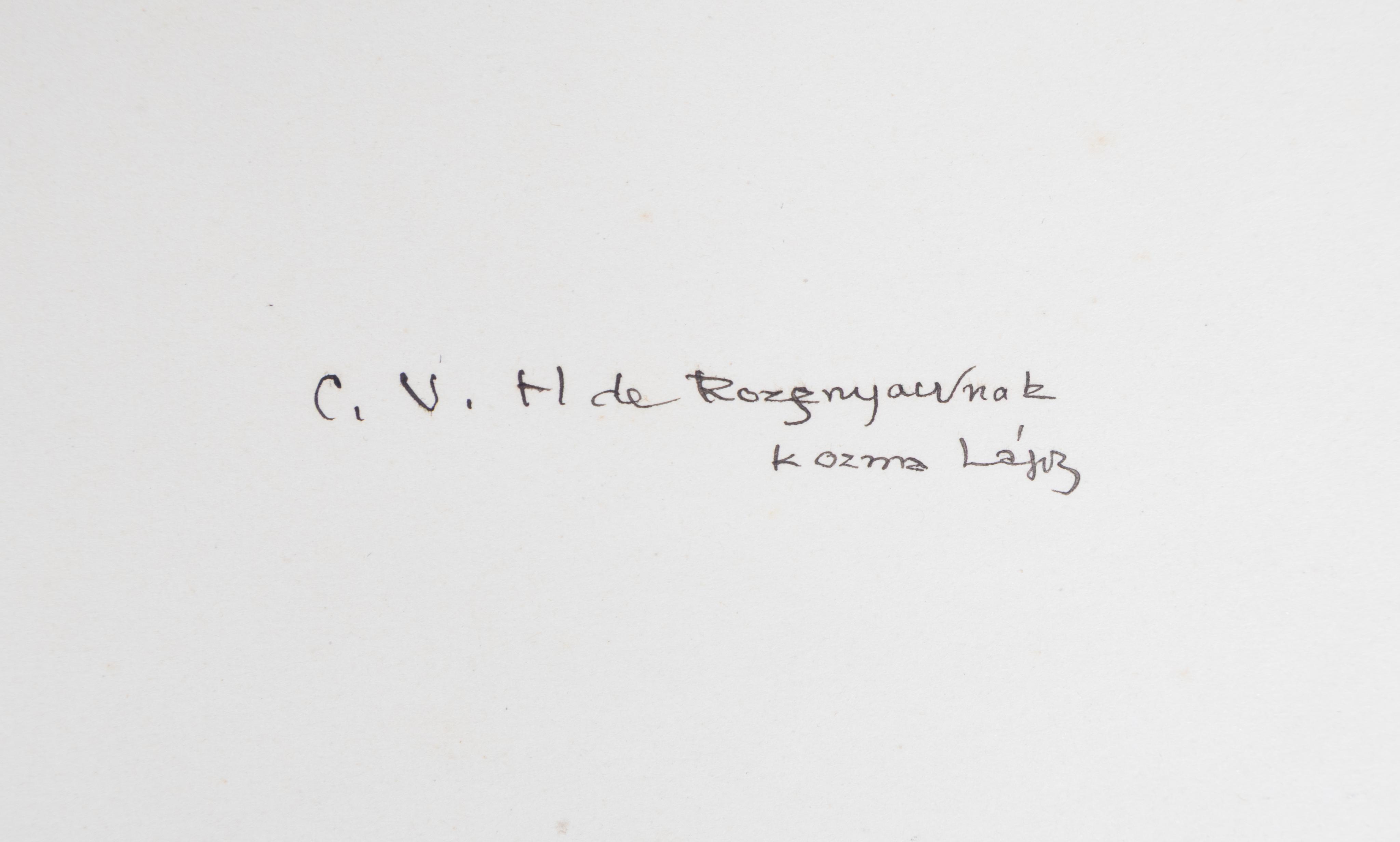 Az elülső előzéklapon Kozma Lajos dedikációja Rozsnyay Kálmán (névváltozatai: Hoschke, van der Hoske, Rozsnyai, írói álneve: Sydney Carton. 1871–1948) grafikus, hírlapíró, műfordítónak. A magyar ex-libris kultúra megteremtésében és népszerűsítésében fontos szerepet vállaló világlátott, a nagyváradi Holnap kültagjaként is ismert Rozsnyay kifinomult ízlésével, grafikai ismereteivel, irodalmi és művészeti tájékozottságával, kiterjedt kapcsolatrendszerével jelentős hatással volt a magyar könyvművészetre, s különösképpen a Kner családra.