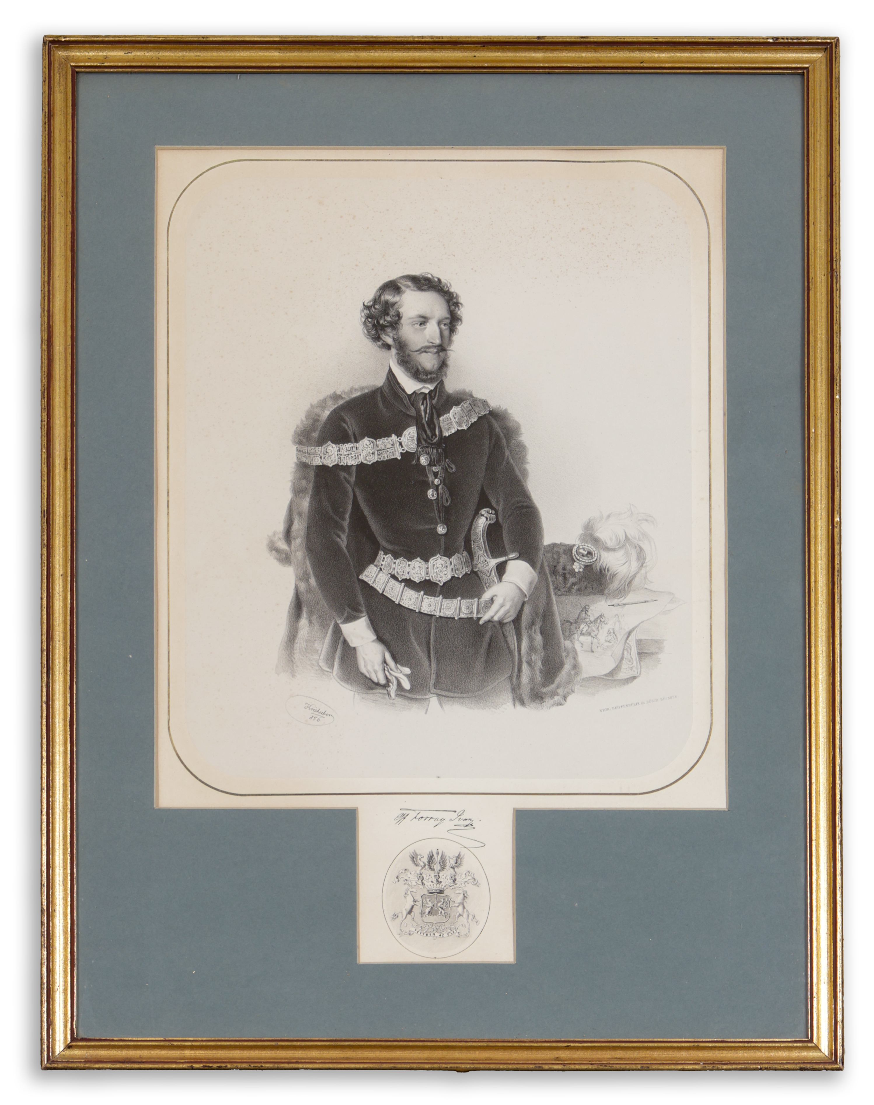 Stone print, after a drawing by Josef Kriehuber, 1856. Iván Soborsini Forray, Count (1817-1852), imperial and royal chamberlain, major general, traveller and painter. Printed signature of the Count and family coat of arms below the picture.