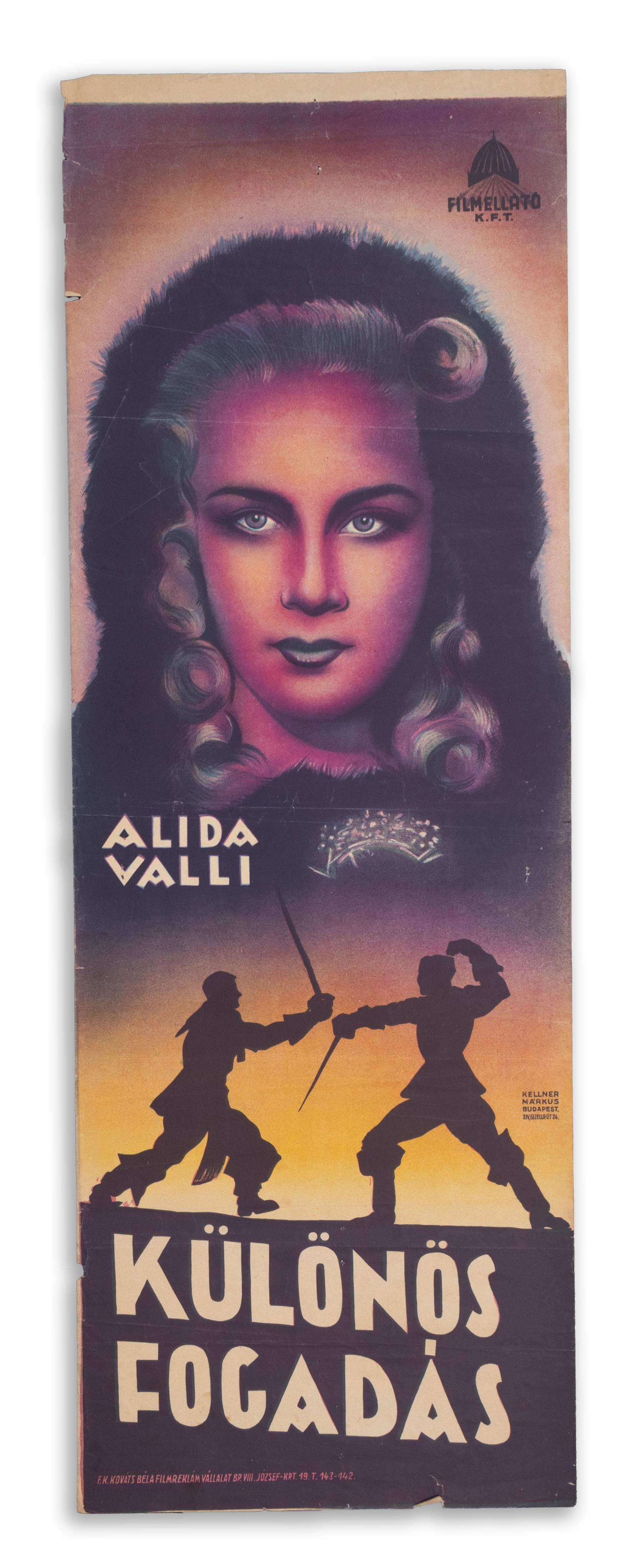 Hungarian vintage movie poster of The First Woman Who Passes (La prima donna che passa), a 1940 Italian historical comedy film directed by Max Neufeld and starring Alida Valli, Carlo Lombardi and Niní Gordini Cervi. The film is set at the 17th-century French Court, Cardinal Richelieu bets with two courtesans about the possibility that by midnight he succeeds in conquering the first woman who will pass at that time.