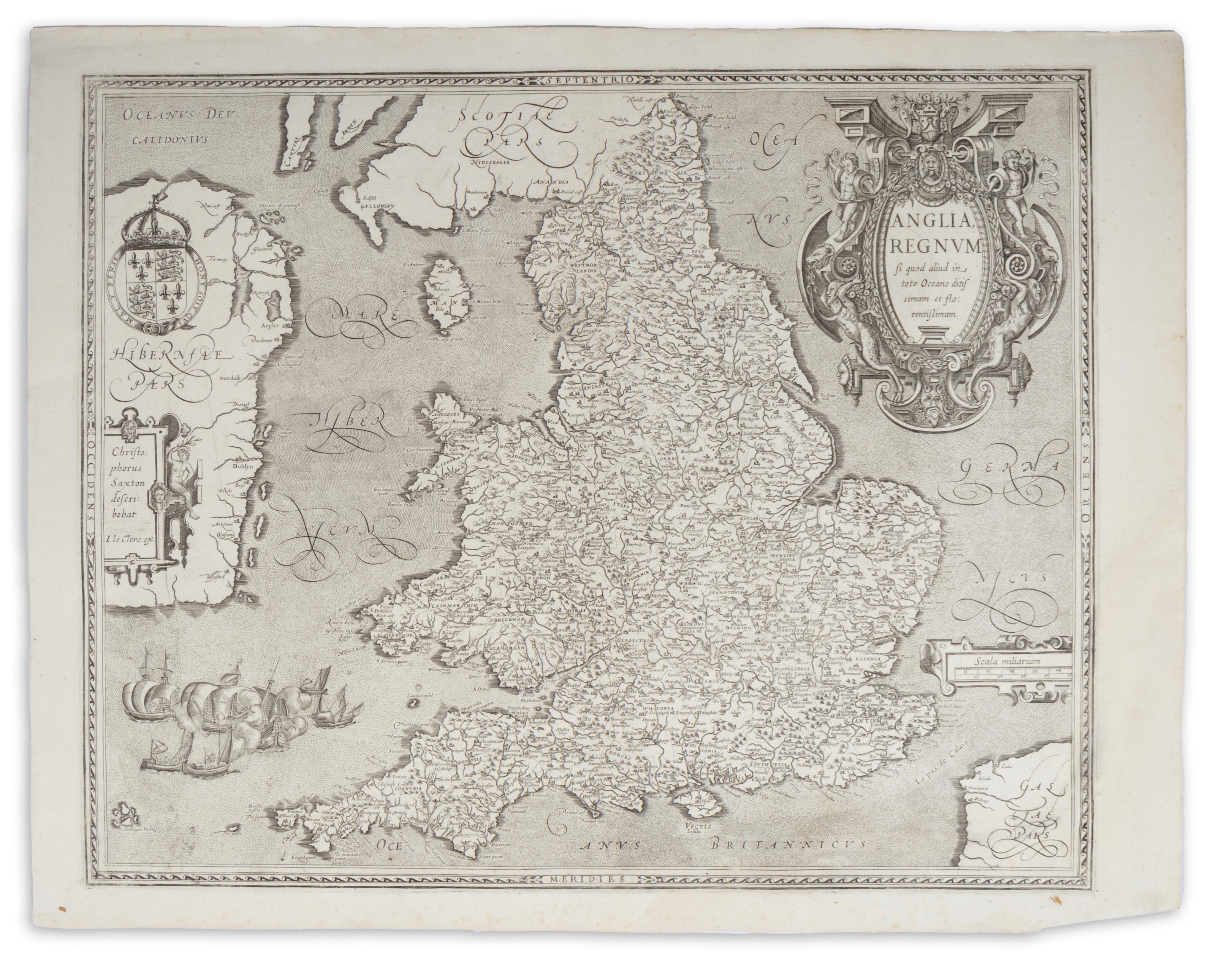 Paris, 1605.Anglia és Wales Jean Le Clerc által készített, ritka, rézmetszetű térképének első állapota. A gyönyörű lap térképészeti alapjául – a kartusban a kartográfust is megnevezi – Christopher Saxton 1579-es regionális ábrázolását használta. Saxton az 1570-es években kapott megbízást a térség módszeres felmérésére és feltérképezésére, amelynek eredményeképp született meg Anglia és Wales első teljes atlasza, az „Atlas of the Counties of England and Wales”. A metszeten három kartus kapott helyet. A címmezőt a jobb oldalt uraló, grandiózus, növényi ornamensekkel, puttókkal és szatírokkal ékesített keretdísz övezi, a másik kettőben pedig a vonalas aránymérték, illetve a Saxtonra való utalás és Le Clerc szignója található. A metsző Cornwall partjai közelében egy tengeri ütközettel illusztrálta a munkát, és az Ír-sziget északi részén I. Erzsébet koronás címere is helyet kapott, amelyet a térdszalagrend szimbóluma keretez annak jelmondatával: „Hony soit qui mal y pense”. Mivel a kinyomtatott példányokat önálló lapként, vagy kompozit-atlaszok részeként értékesítették, a mostoha tárolási körülmények miatt a fennmaradt példányok nagy része – darabunkkal ellentétben – kifejezetten rossz állapotú.