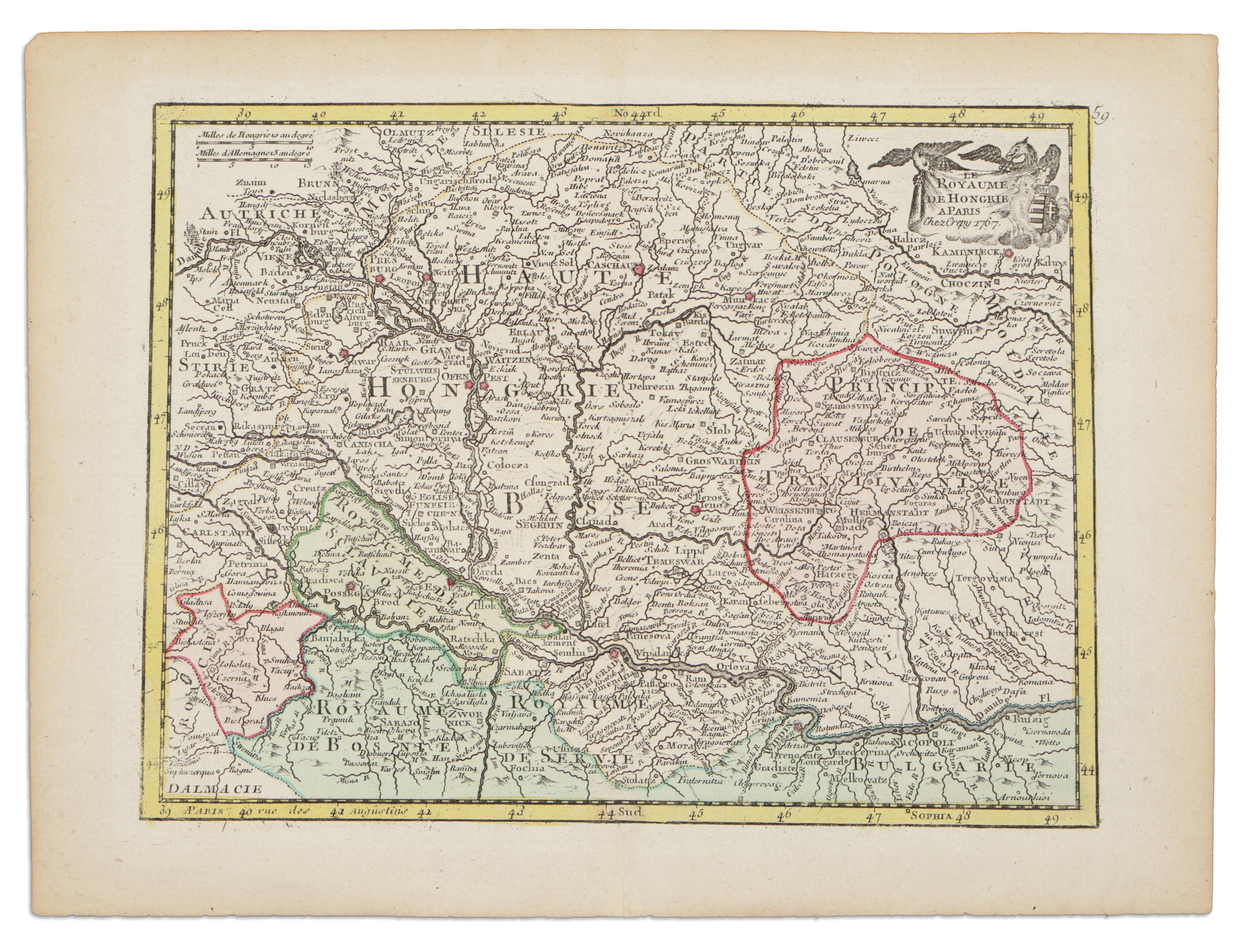 Border coloured copper-engraved map of Hungary, Transylvania and neighbouring regions.