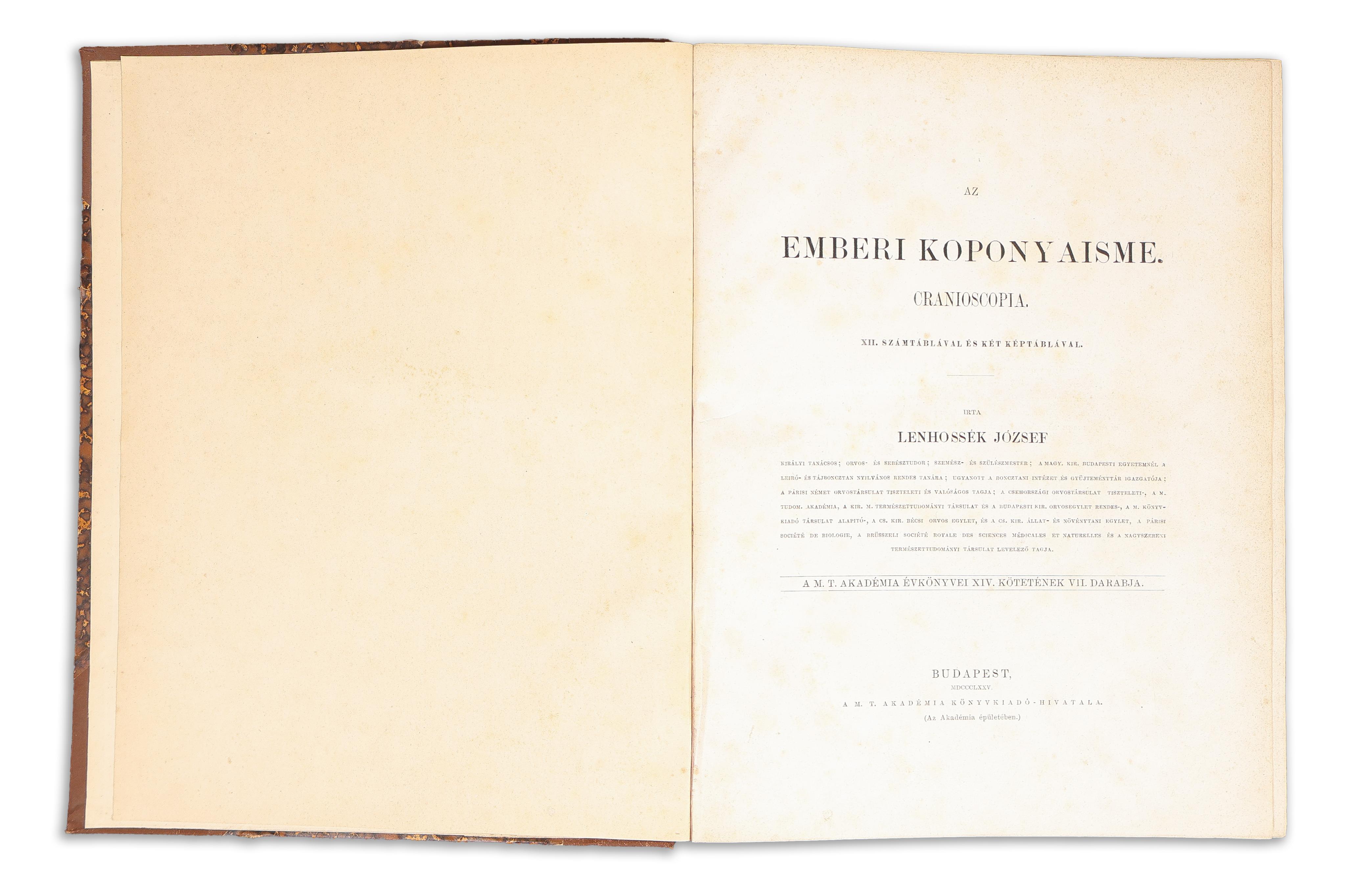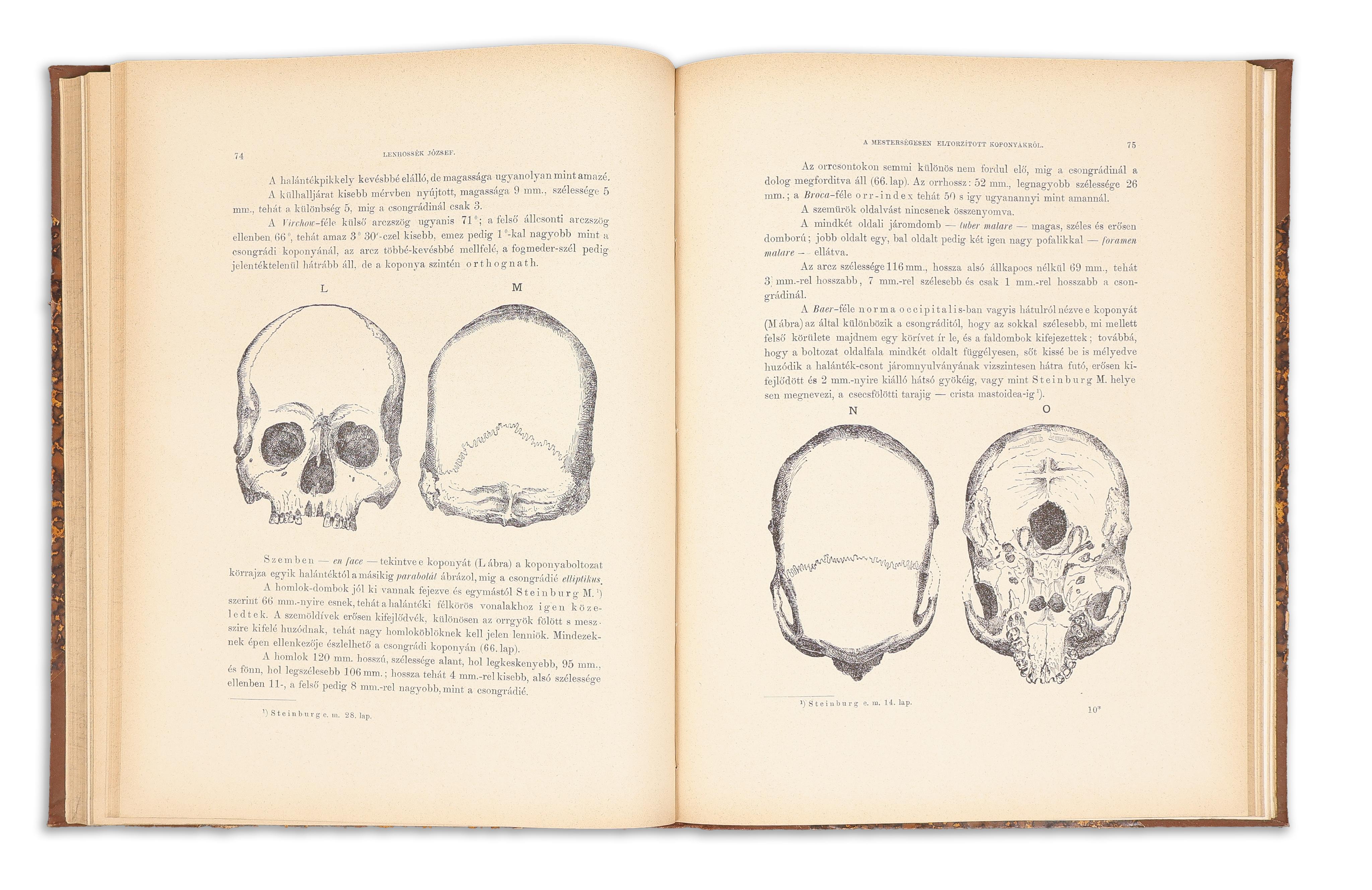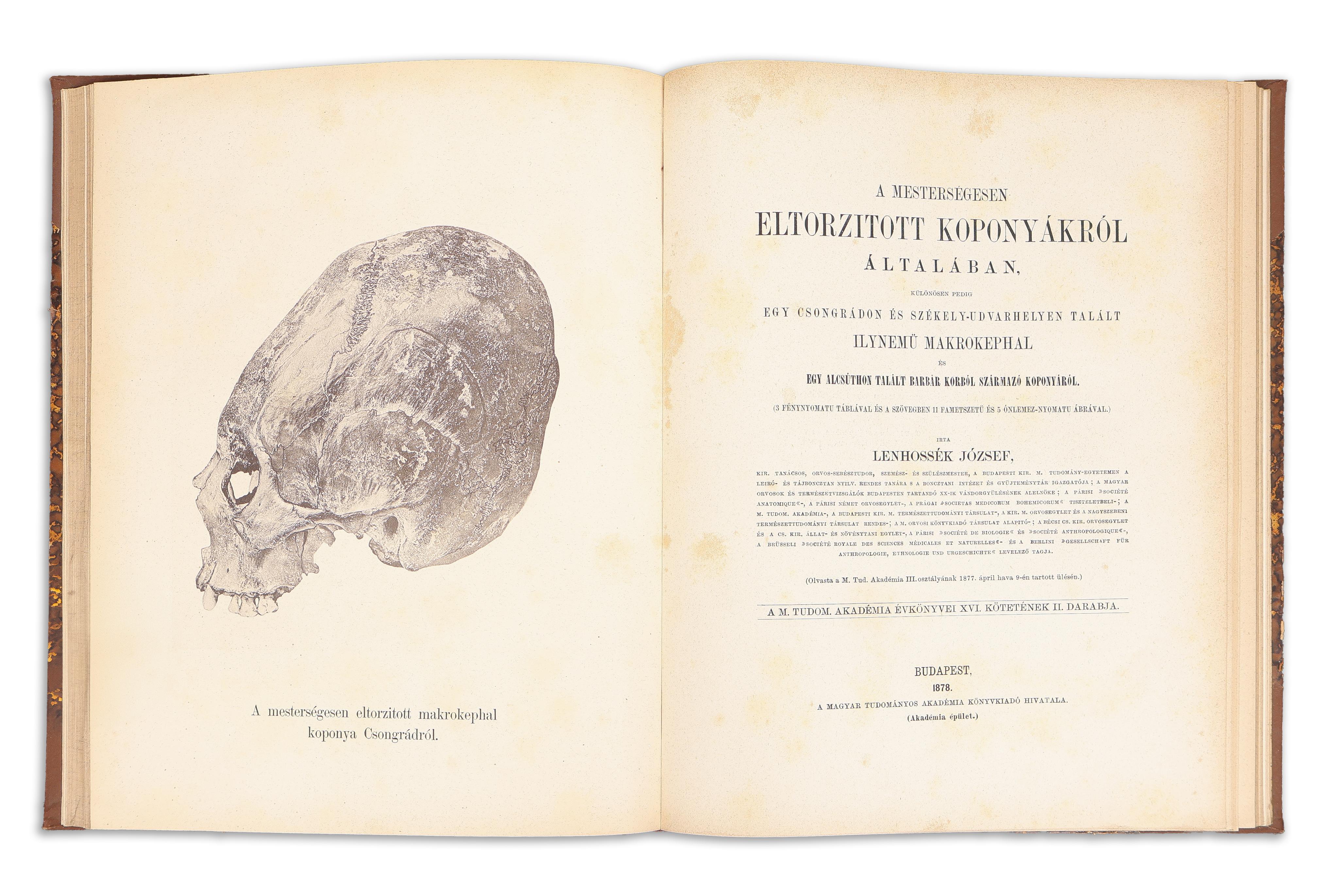 Lenhossék József: A mesterségesen eltorzitott koponyákról általában, különösen pedig egy Csongrádon és Székely-Udvarhelyen talált ilynemü makrokephal és egy Alcsúthon talált barbár korból származó koponyáról. (3 fénynyomatu táblával és a szövegben 11 fametszetü és 5 ónlemez-nyomatu ábrával.)