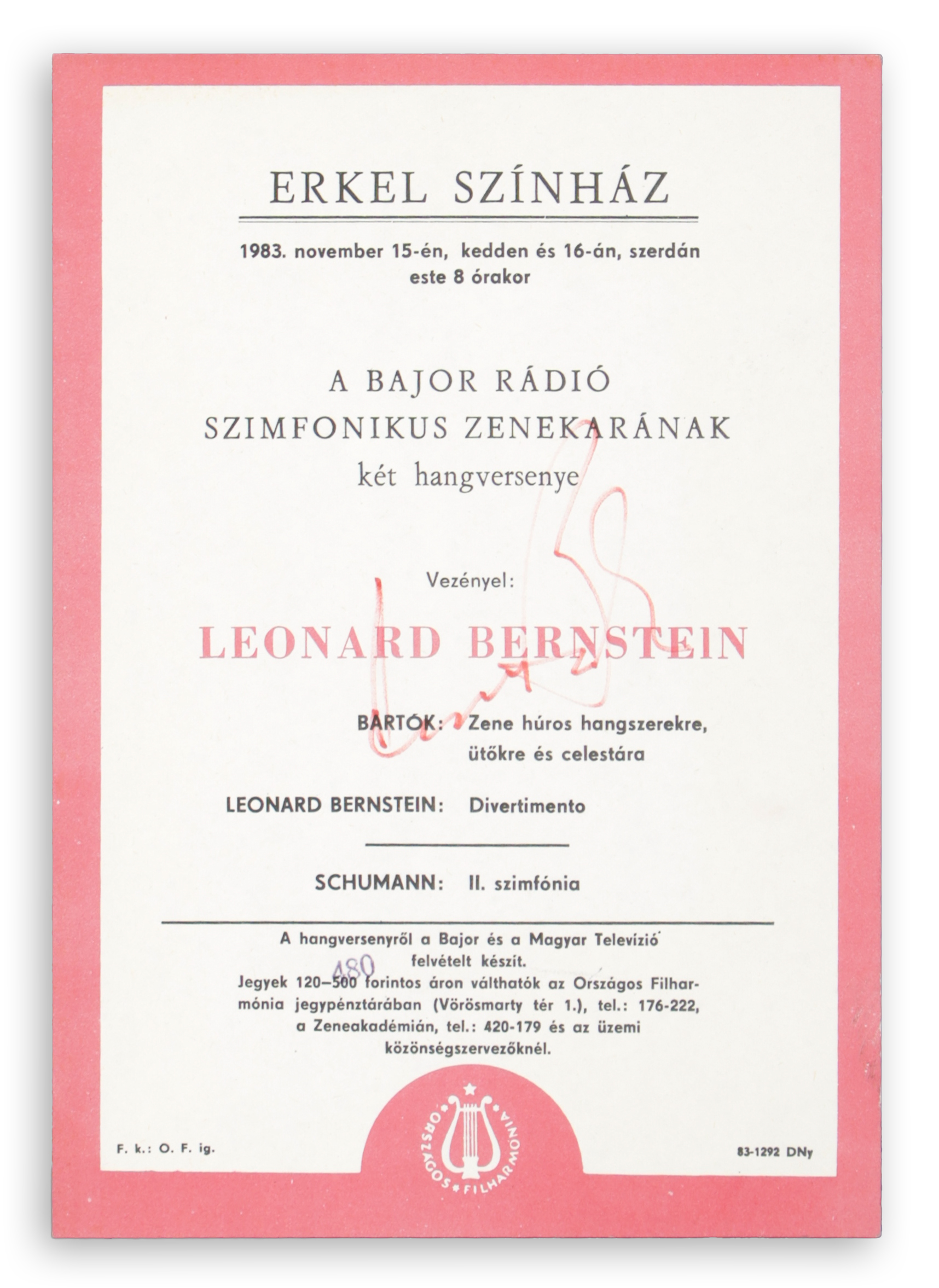 Signed in red felt-tip pen by world-famous conductor and composer Leonard Bernstein (1918-1990) on the flyer for two concerts of the Bavarian Radio Symphony Orchestra at the Erkel Theatre, 15-16 November 1983.