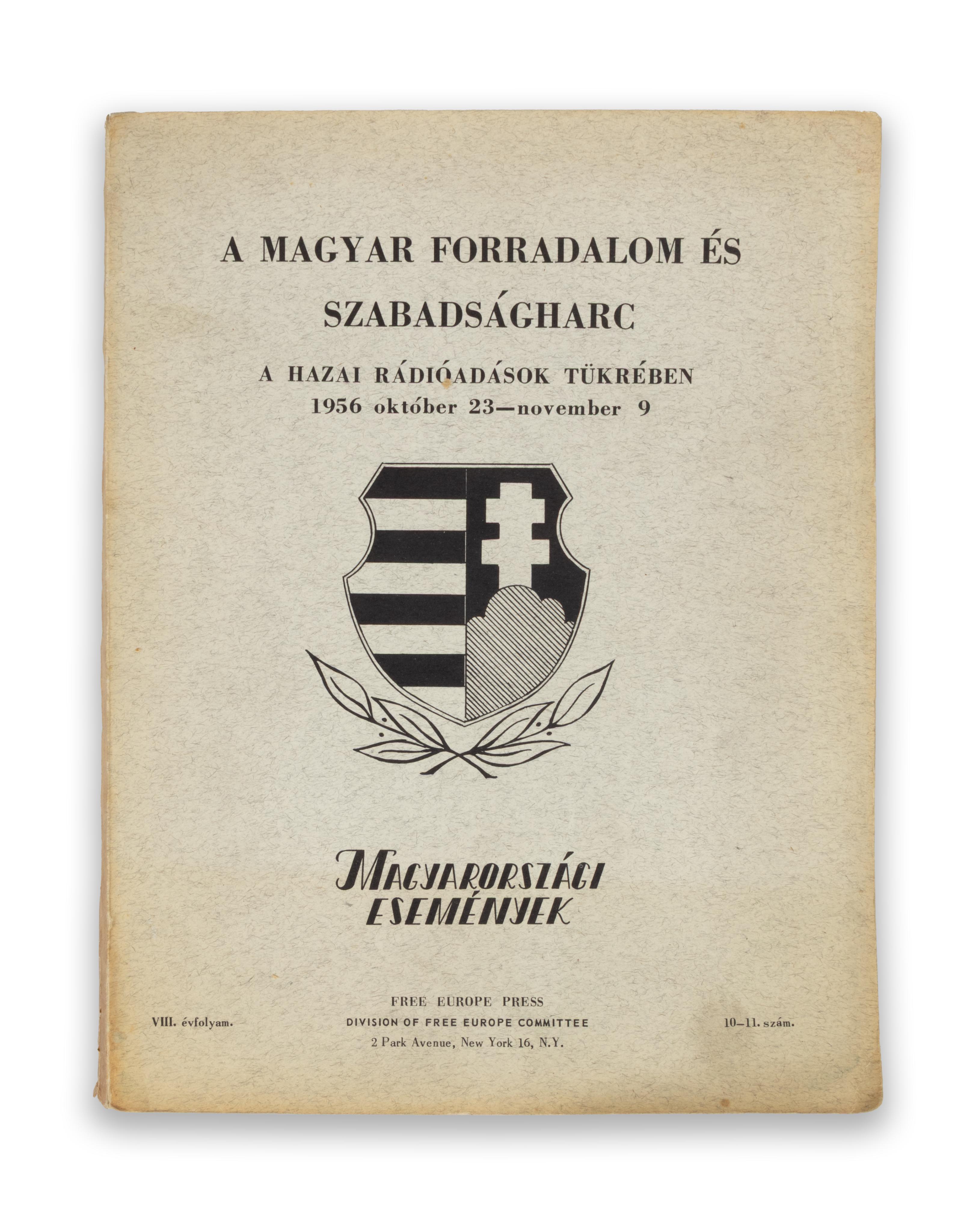 The Hungarian Revolution and War of Independence as Reflected in Hungarian Radio Broadcasts. October 23 - November 9, 1956. American Hungarian-language historical and political publication published in the USA.