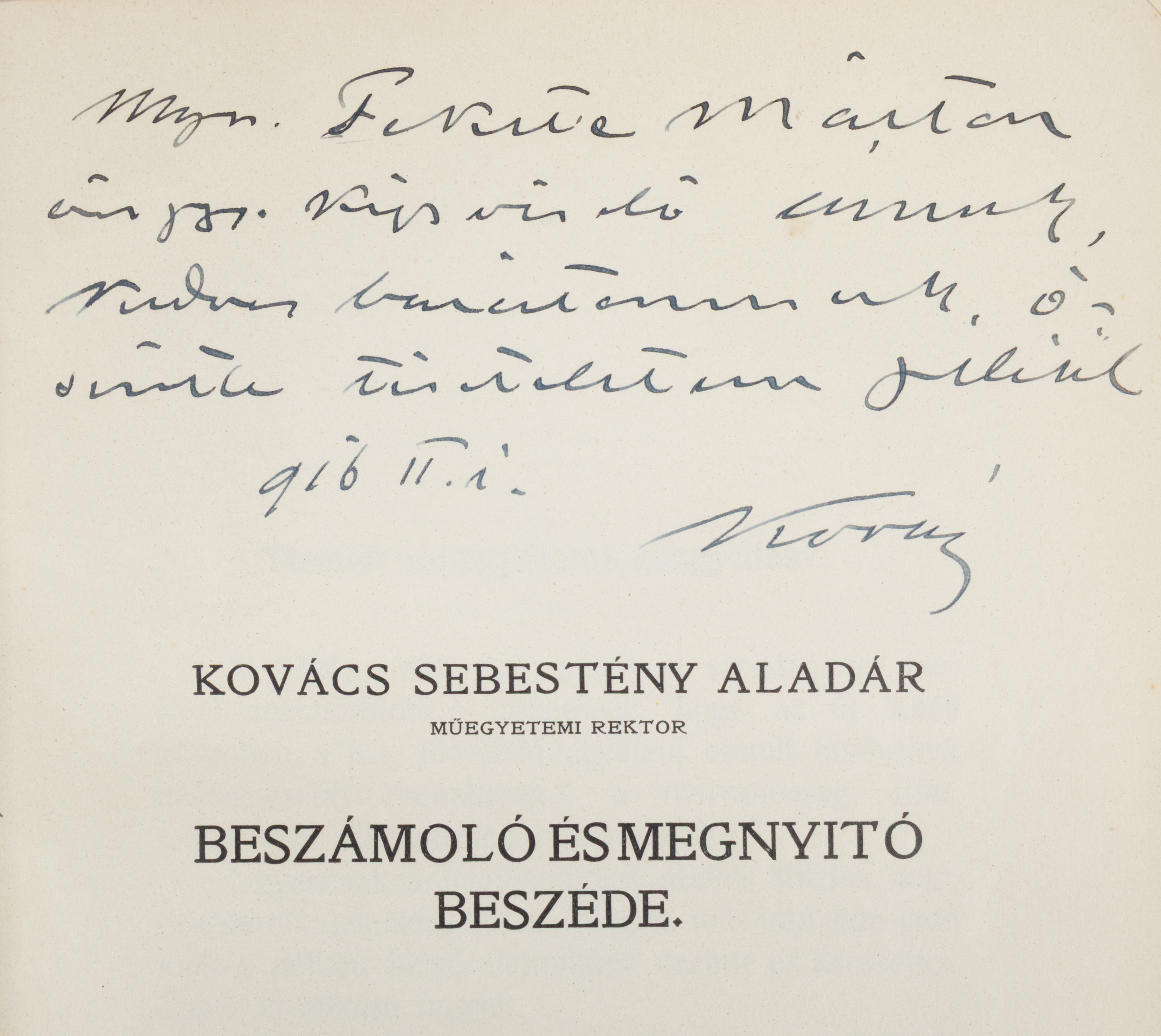 A belső címlapon a rektor tintával írt dedikációja Fekete Márton ogy. képviselő - szentesi ügyvéd, kormánybiztos - úrnak.