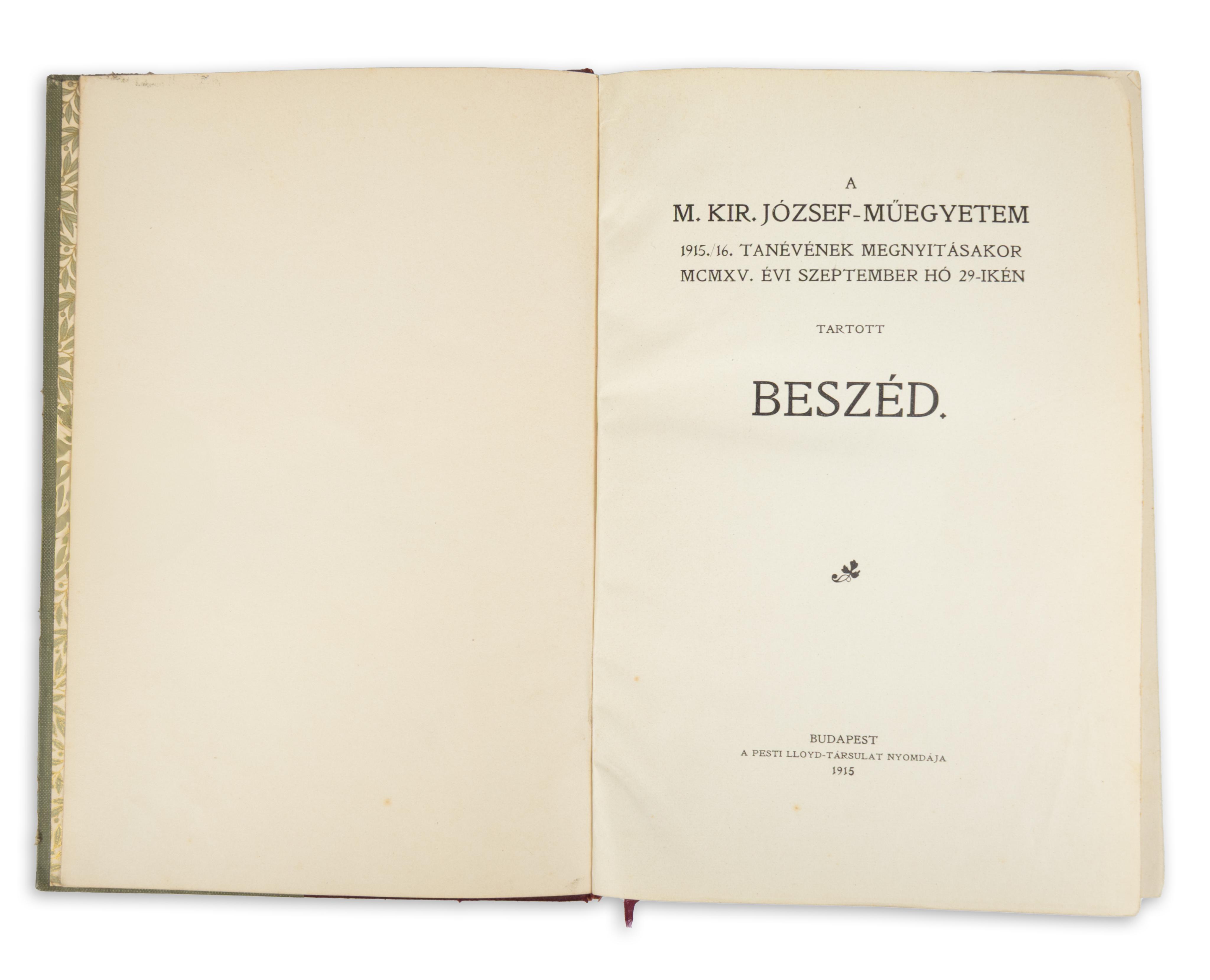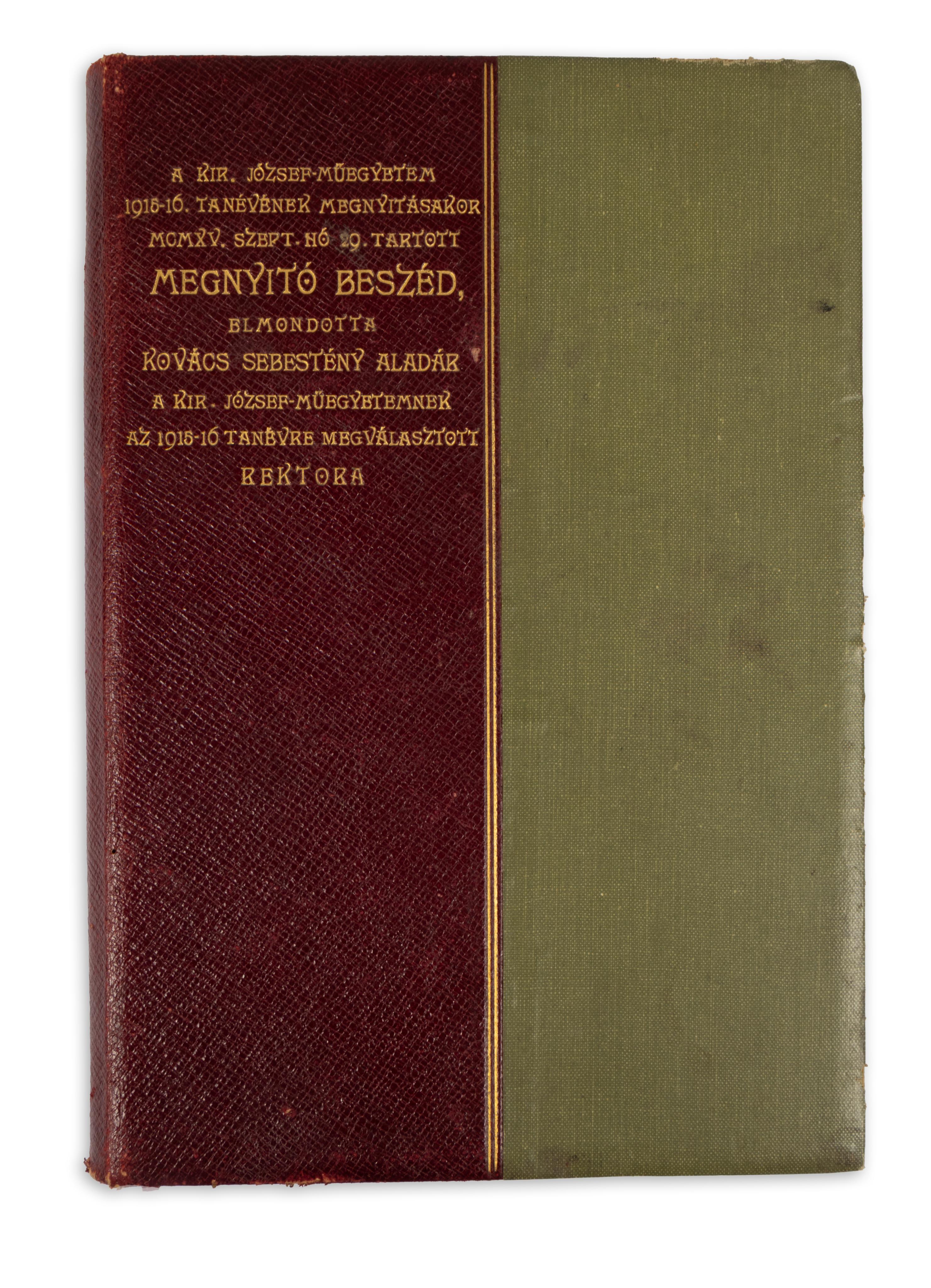 Elékötve: A M. kir. József műegyetem 1915/16. tanévének megnyitásakor MCMXV. évi szeptember hó 29-én tartott beszéd. Kovács Sebestyén Aladár műegyetemi rektor beszámoló és megnyitó beszéde. 78 p. + 1 kihajt mell.