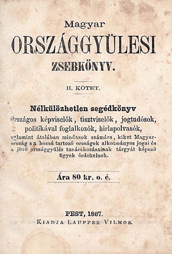 Magyar országgyűlési zsebkönyv. II. kötet. Nélkülözhetetlen segédkönyv országos képviselők, tisztviselők, jogtudósok, politikával foglalkozók, hírlapolvasók... számára...