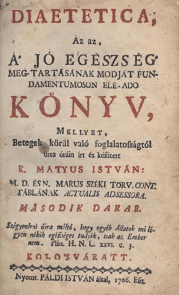 Diaetetica, Az az, a' jó egészség' meg-tartásának modját fundamentumoson elé-ado könyv, Mellyet Betegek körül való foglalatosságtól üres óráin írt és készített ---. II. darab.