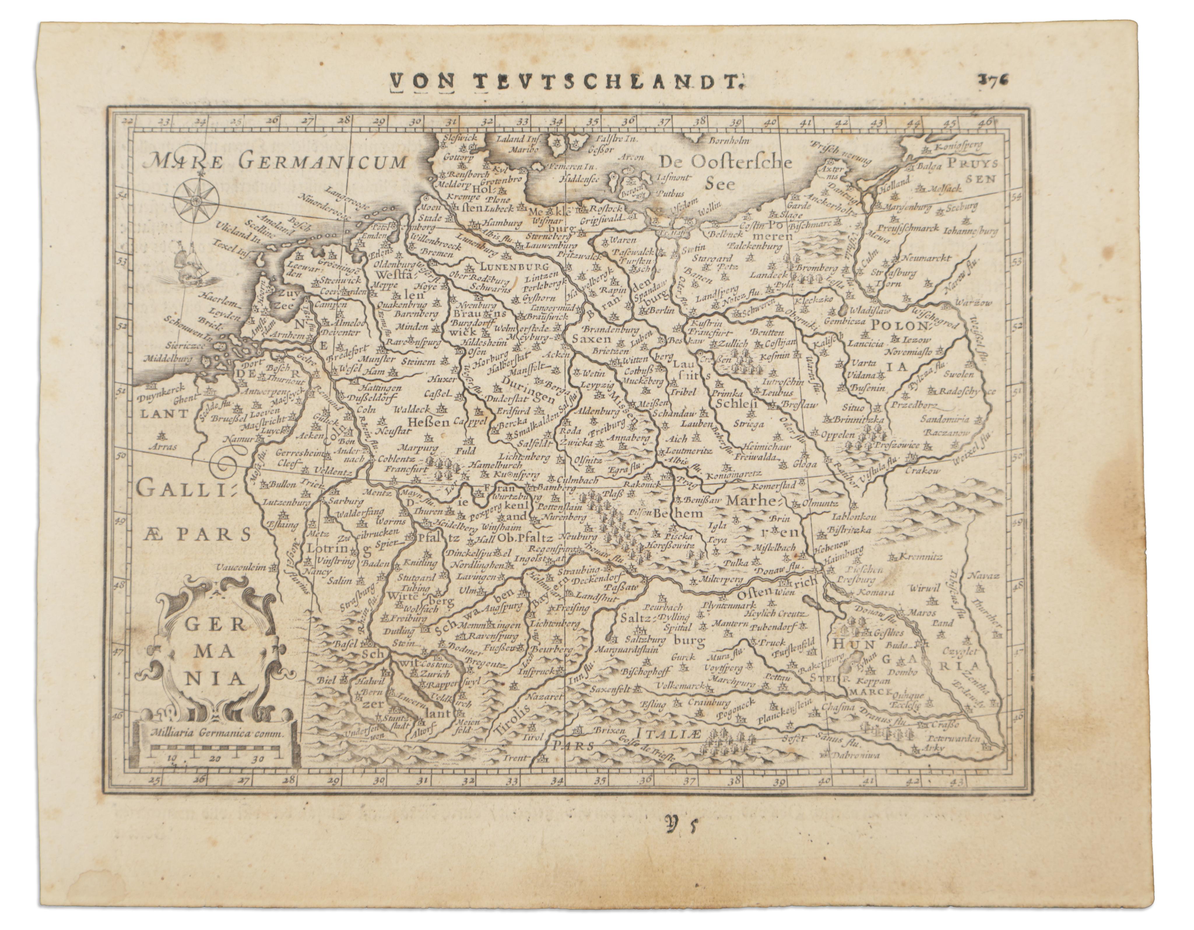 Copper engraved map of Germany from Jansson's edition of Mercator's Atlas Minor (2nd German edition, 1651). Page number 176, text in German on the verso.