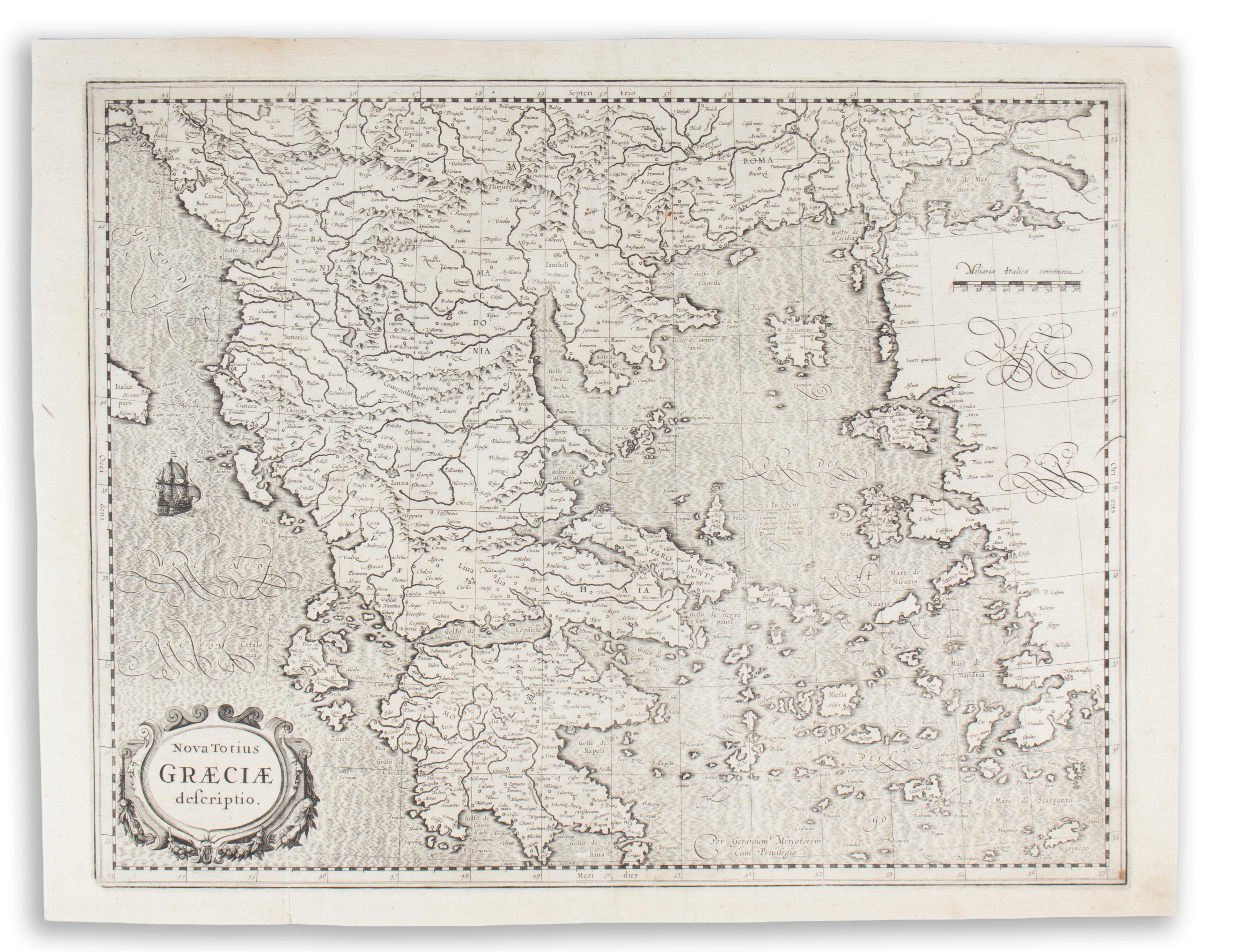 Rare copperplate map of Greece and the Aegean Sea. Decorative elements include a sailing ship, sculpted waves on the sea and an ornate cartouche.